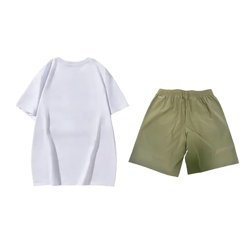 Комплект: белая модная рубашка армейского зеленого цвета с короткими рукавами + армейские холщовые шорты зеленого цвета