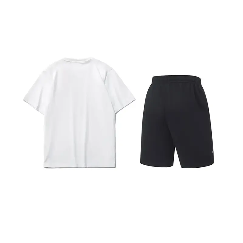 Комплект: белая рубашка с короткими рукавами и черные короткие спортивные штаны.