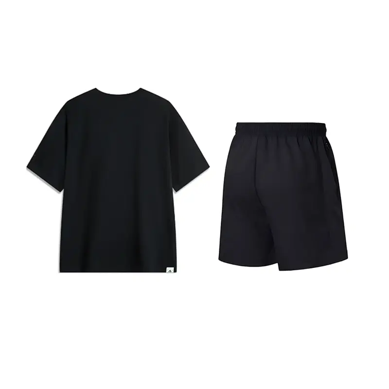Комплект: черная рубашка с короткими рукавами и черные спортивные шорты.