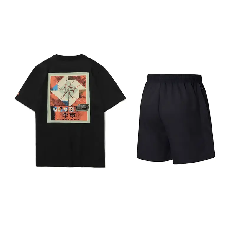 Комплект: черная рубашка с короткими рукавами и черные спортивные шорты.
