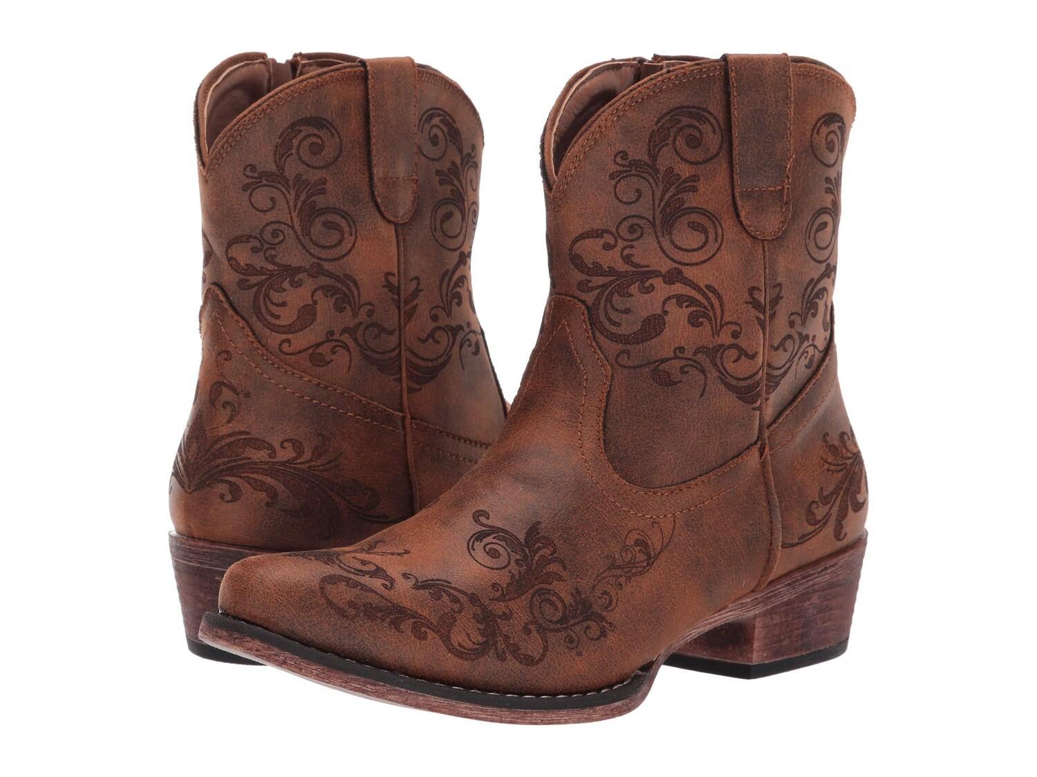 Ботинки Roper Short Stuff идеально сочетают западный шик и современный комфорт. Верх из слегка полированной искусственной кожи с цветочным узором, вырезанным лазером. Модные ботинки среднего профиля с внутренней застежкой-молнией во всю длину для удобного надевания и снятия. Мягкая искусственная подкладка для комфортной посадки и ощущения. Мягкая стелька для дополнительного комфорта под ногами. Наборный каблук с потертой отделкой. Круглый носок. Легкая искусственная подошва с резиновой накладкой в области пятки для надежного сцепления. Импортировано. Замеры товара были сняты для размера 8,5 и ширины M. Обратите внимание, что измерения могут различаться в зависимости от размера. Размеры: Высота каблука: 1 1/4 дюйма Вес: 13 унций Окружность: 11 1/2 дюйма Голенище: 7 1/2 дюйма