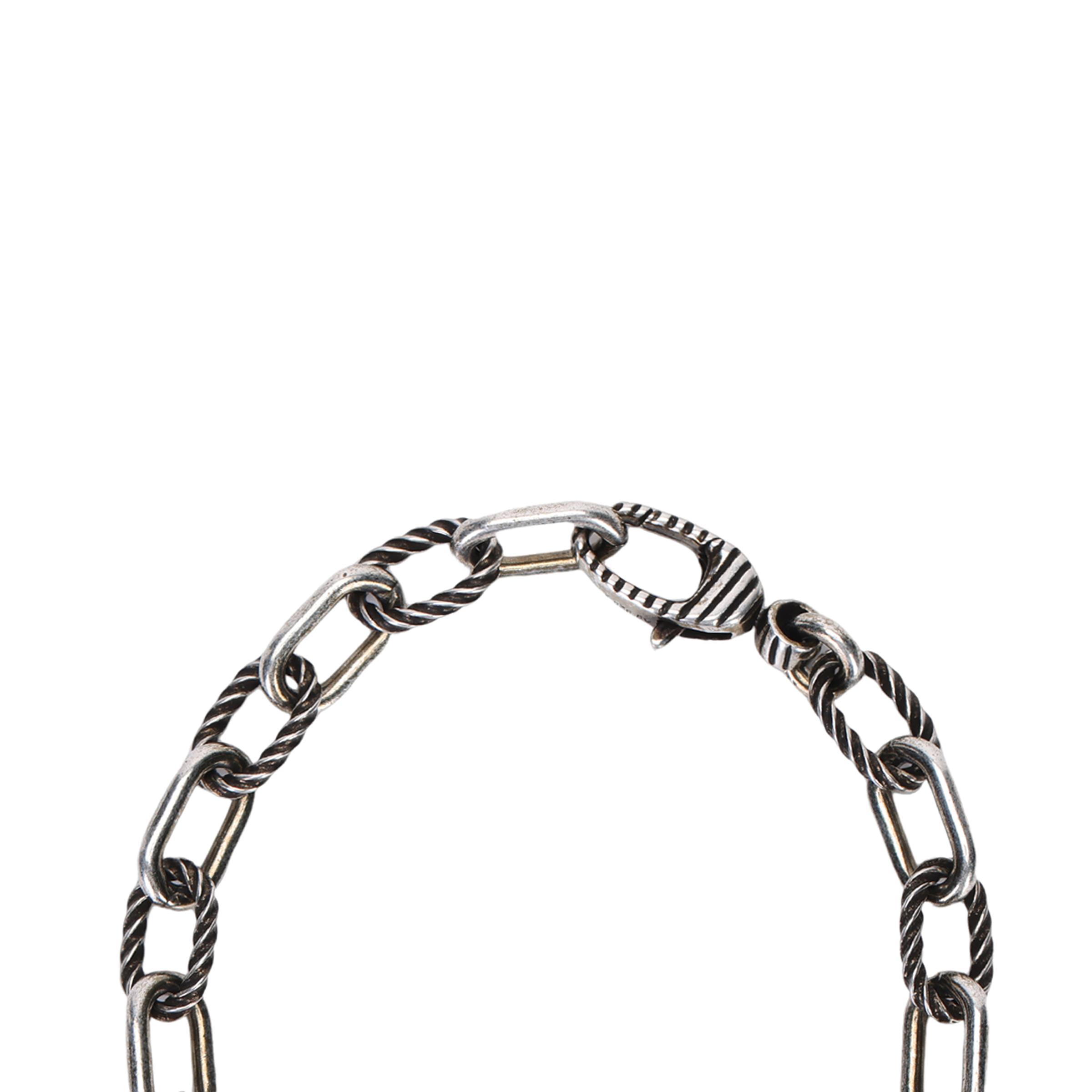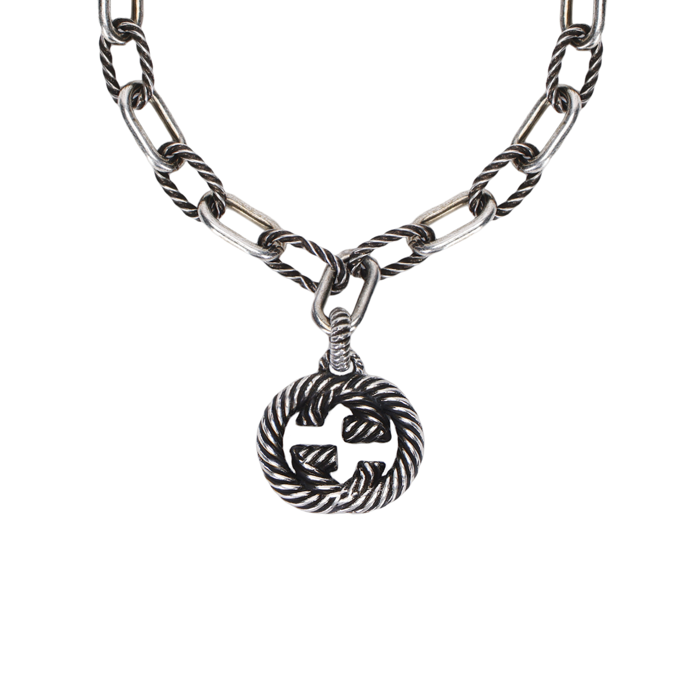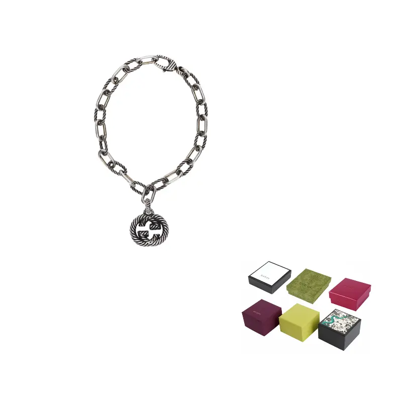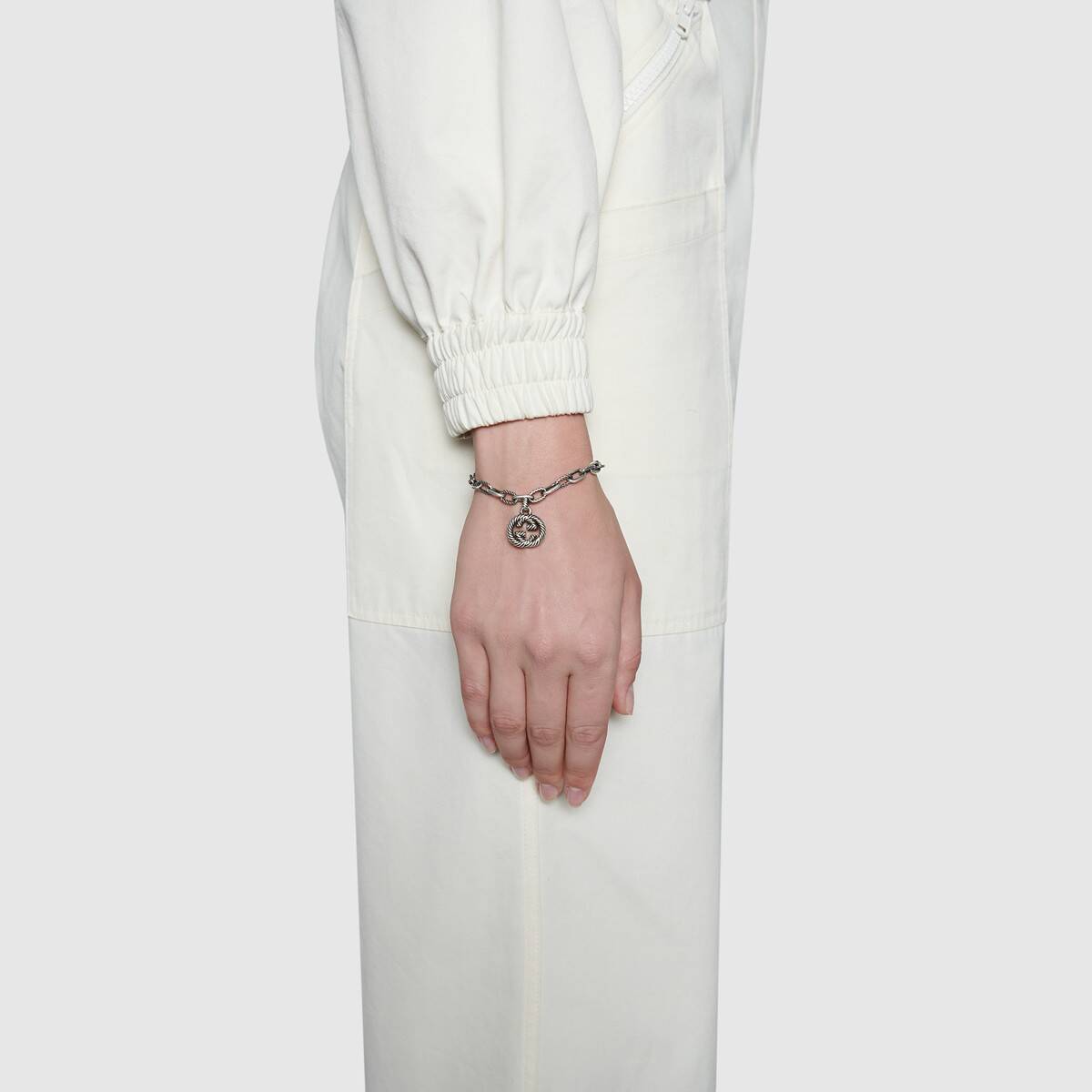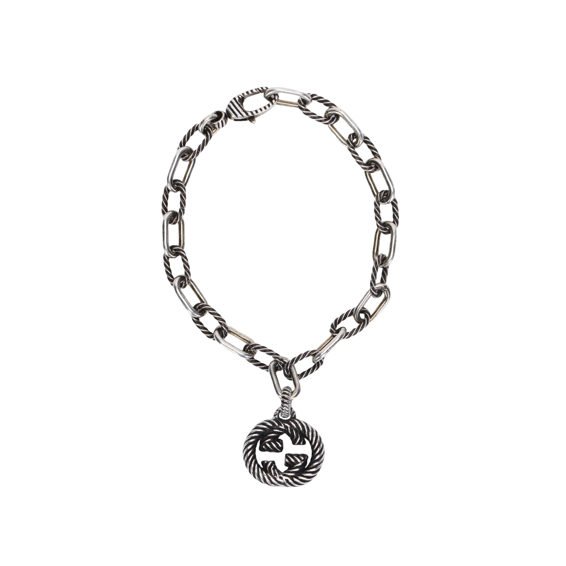 Этот браслет выполнен из серебряной цепочки с чередующимися текстурированными и гладкими звеньями, воплощая современную и стильную эстетику. Подвеска с переплетенными двойными буквами G украшена фирменным логотипом бренда. Изделие прошло процесс состаривания, что придает ему винтажный вид; любые следы старения на полученном вами изделии являются нормой.