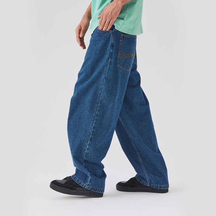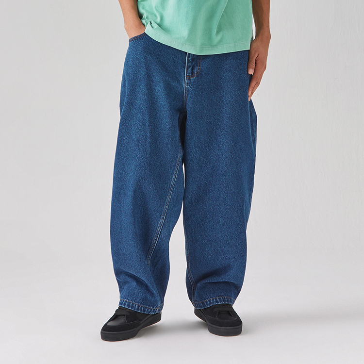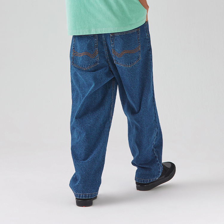 Классические джинсы VISION свободного кроя; изготовлены из плотной джинсовой ткани, окрашены, выстираны и обработаны силиконовым маслом для сохранения жесткого силуэта, оставаясь при этом мягкими на ощупь и удобными в носке; после стирки поверхность приобретает эффект фактуры камня и подвергается более чем десятку сложных процессов, таких как расшлихтовка, мойка с камнями и мойка с песком, чтобы восстановить деревенский и винтажный вид винтажных джинсов; на правом переднем кармане находится классическая тканая этикетка бренда BOX-LOGO, а задний карман выполнен в эксклюзивном дизайне джинсовых карманов VISION: трехстежковый вышитый толстой иглой узор в виде буквы «V», который виден только при носке, добавляя изюминку общему облику; пояс сзади выполнен из высококачественной коровьей кожи с тисненым логотипом.