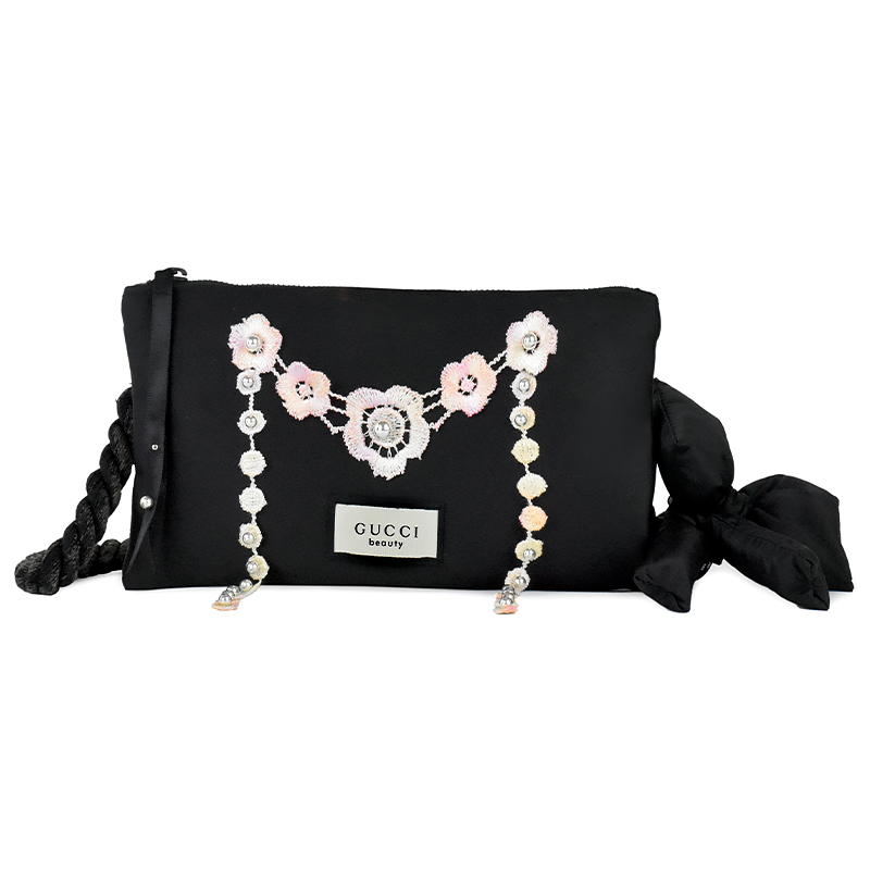 Эта сумка-шар, изготовленная на заказ, изготовлена из оригинальной черной шелковой атласной косметички Gucci, в которую удобно положить косметические принадлежности. Избегать царапин от острых предметов, длительного замачивания и сушки при высоких температурах.