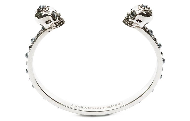 Браслет с двумя черепами, украшенный кристаллами Swarovski и искусственным жемчугом по внешнему краю и в местах расположения черепов. Внутренняя часть украшена логотипом Alexander McQueen. Винтажное серебро, фурнитура из латуни.