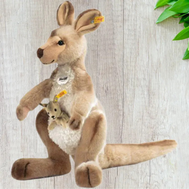 Кенгуру KANGO Steiff by Steiff изготовлен вручную из мягкого, очаровательного бежевого плетеного меха с заостренной головкой и украшен знаменитыми «золотыми серьгами» Steiff с желтой биркой.