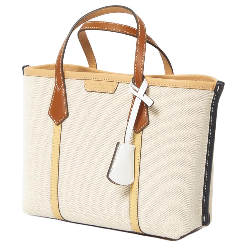 Цвет: белый; Материал: 100% холст; Описание: Маленькая сумка-тоут Perry Canvas из кремового хлопкового холста с бежево-коричневой кожаной отделкой и видимой строчкой. Спереди тисненый логотип Tory Burch, две несъемные ручки, регулируемый съемный плечевой ремень и магнитная застежка. Размер: универсальный, QT, мини.