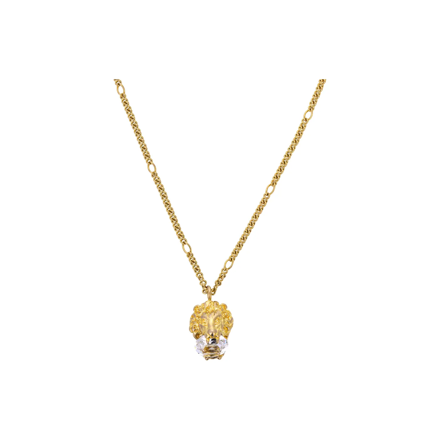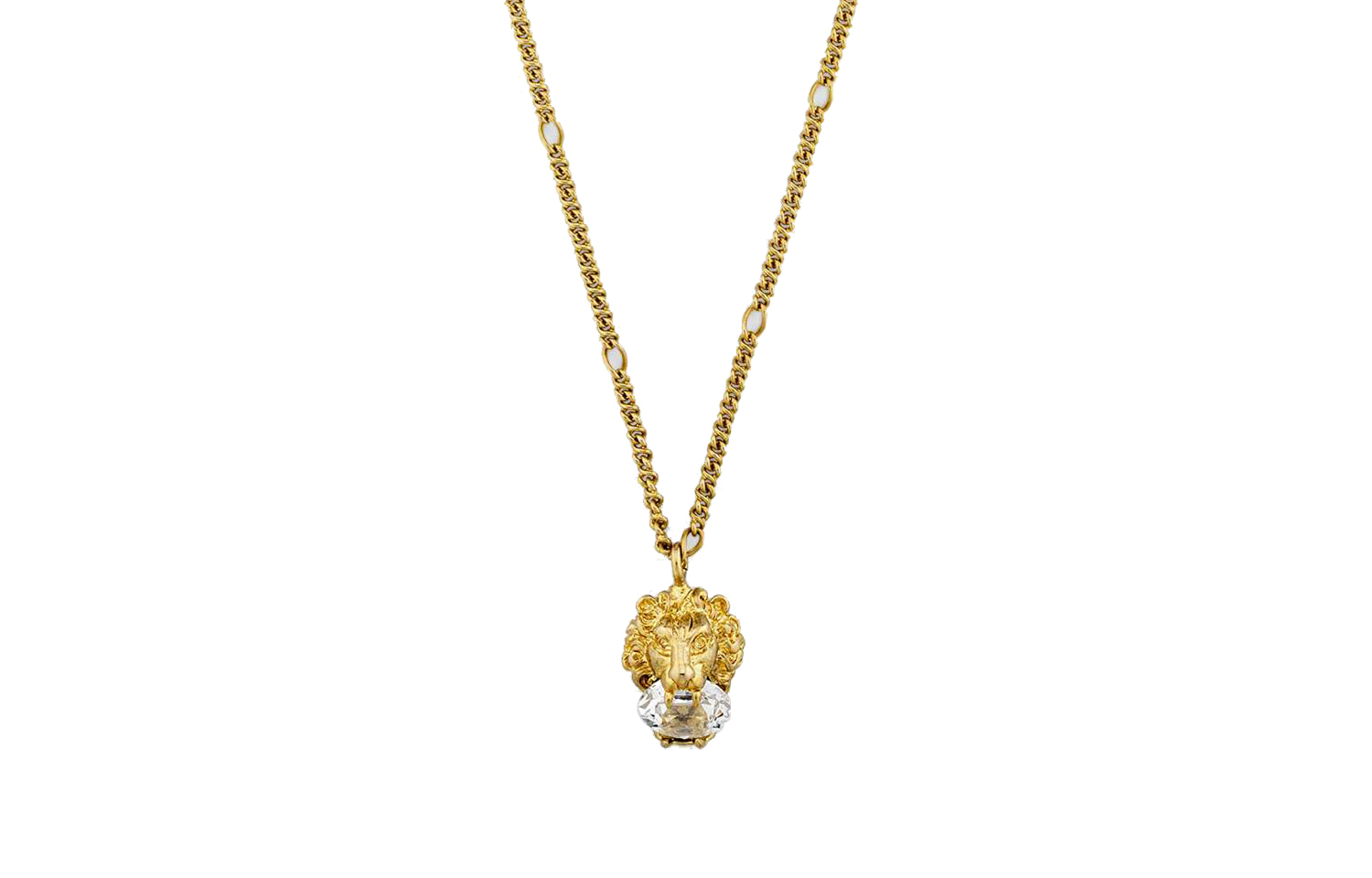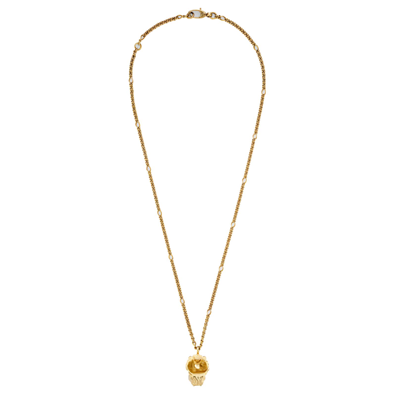 Это ожерелье с подвеской в виде головы льва изготовлено из мерцающего золота, а в пасти льва - ограненные кристаллы. Бескрайние просторы природы и дикая природа всегда были двумя самыми ценными источниками вдохновения для Gucci, а лев, как один из них, стал одним из символов бренда.