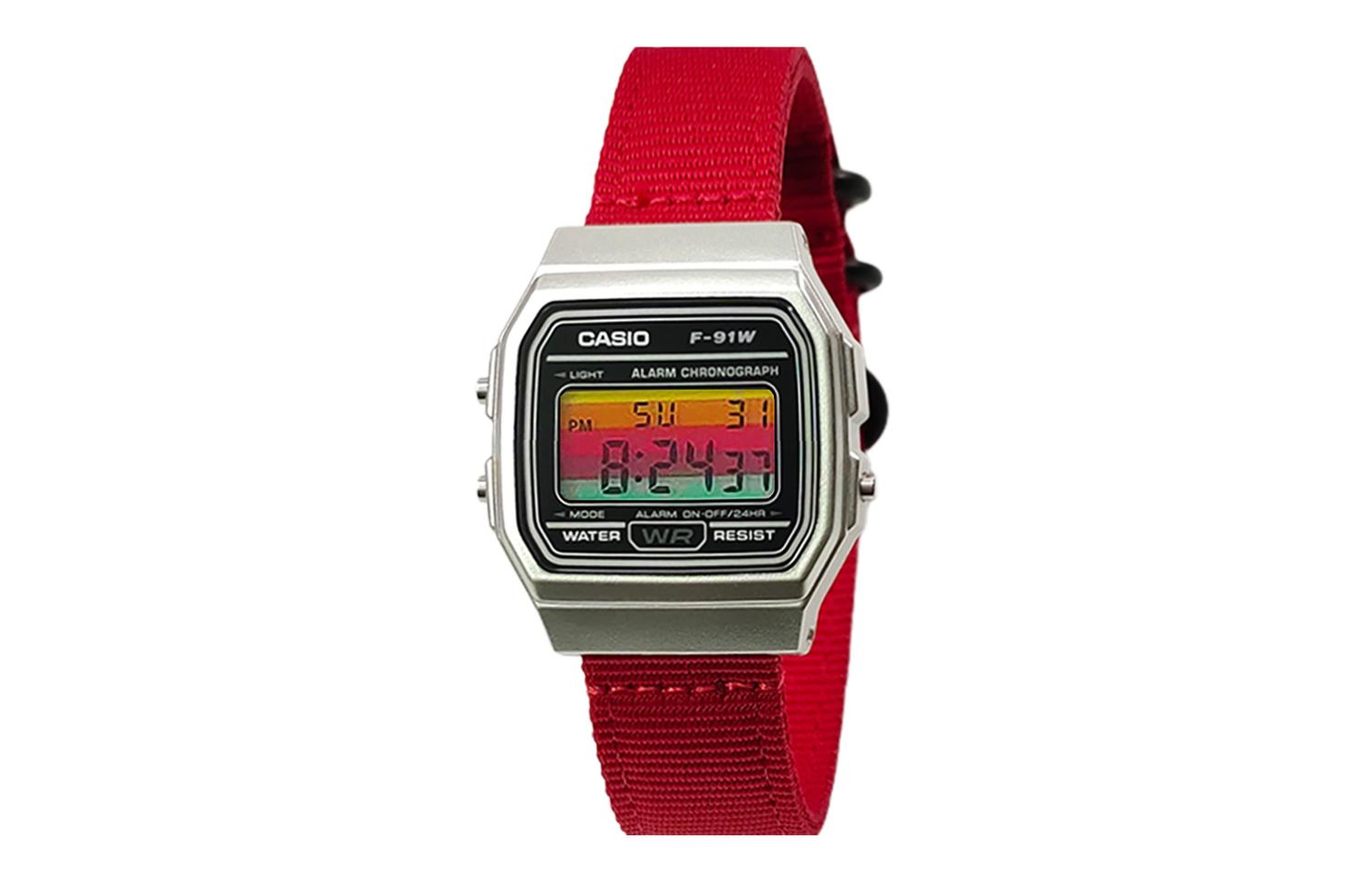 Цвет ремешка: красный ремешок, циферблат с разноцветными горизонтальными полосками