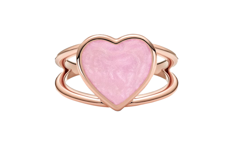 Металл: Pandora Rose (уникальный сплав меди и серебра). Эмаль: перламутр. Узор/форма: Открытое двойное кольцо; большой плоский кабошон в форме сердца, украшенный розовой эмалью с завитками. Особенности: Покрыто непрозрачной розовой эмалью с завитками, создающей эффект розового кварца; расписано вручную. Вдохновение: Техника ручной росписи эмали для создания несовершенной поверхности, напоминающей натуральные драгоценные камни, имитируя их естественные изъяны и природную красоту.