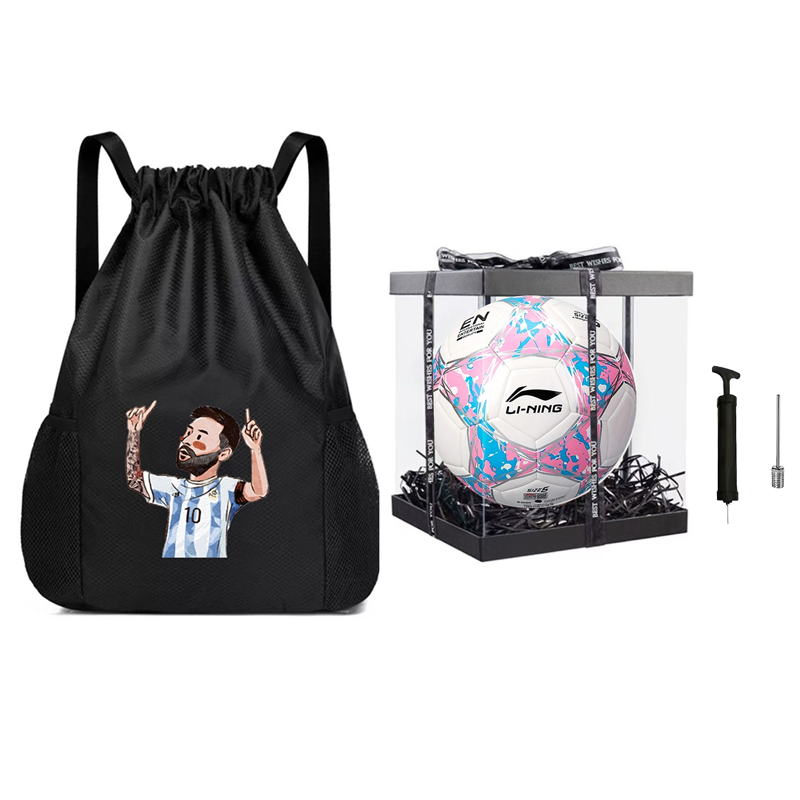 Характеристики коробки: рюкзак с черным принтом + футбольный мяч + насос + игла для накачивания + черная коробка