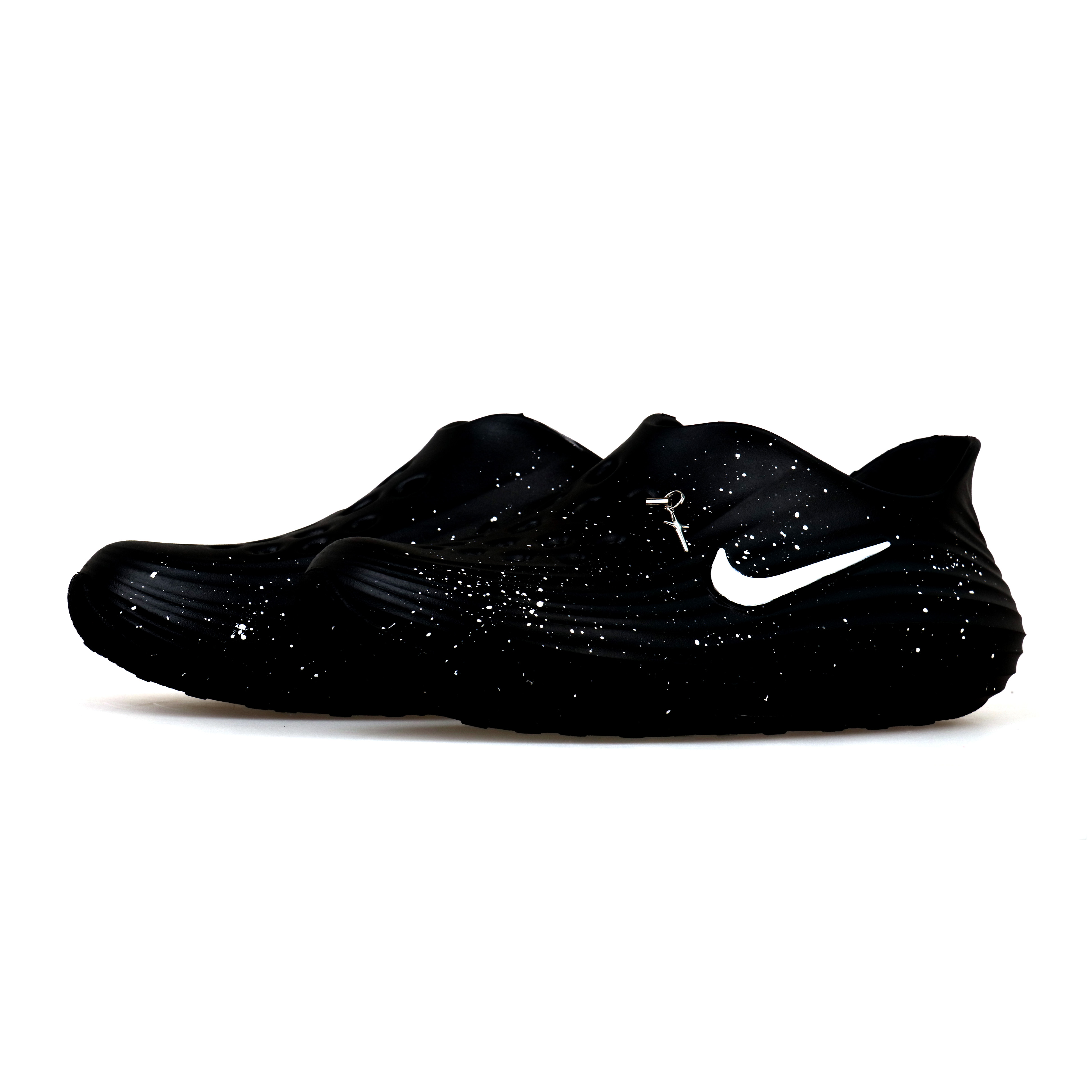 Эти кастомные кроссовки основаны на мужских черных сабо Nike ReactX Rejuven8 (артикул HV5060-001), вдохновленных звездным небом. Верх украшен брызгами краски, имитирующими ночное небо, а добавление декоративных украшений завершает простой, но изысканный стиль. Каждая пара кастомных кроссовок изготавливается вручную, поэтому небольшие отклонения являются нормой. Из-за различий в фотографии, выставочном оборудовании и цветовой температуре источника освещения могут быть небольшие различия в цвете между отображаемыми изображениями и фактическим продуктом. Кастомные кроссовки можно носить и стирать как обычно. Во время ношения избегайте интенсивных физических нагрузок и царапин от острых предметов. Избегайте использования высококонцентрированных органических растворителей для чистки; при чистке рекомендуется использовать мягкую щетку с подходящей концентрацией моющего средства, чтобы аккуратно оттирать.