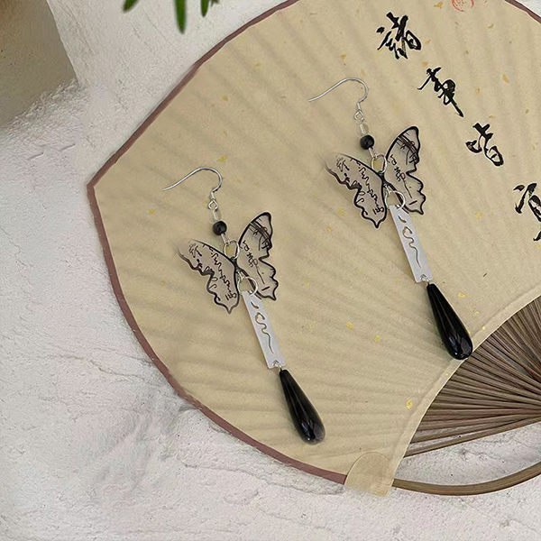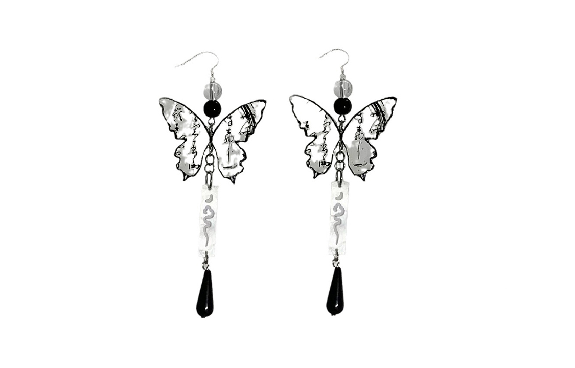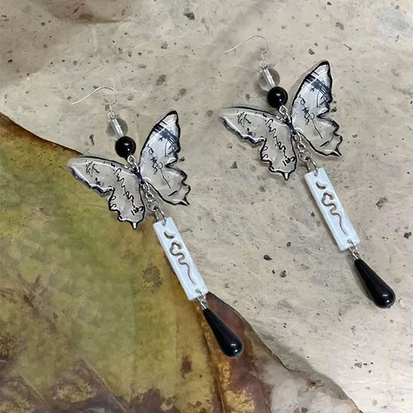 Стиль: Серьги-подвески в виде бабочек с бахромой, выполненные в технике тушевой росписи
