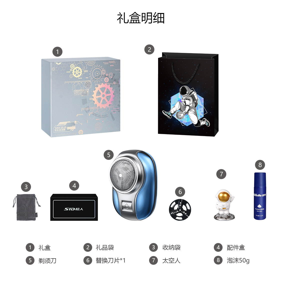 Набор: RS155 Ice Blue + сумка для хранения + коробка для аксессуаров + сменные лезвия + триммеры для волос в носу + украшения в виде астронавта + коробка + астронавт