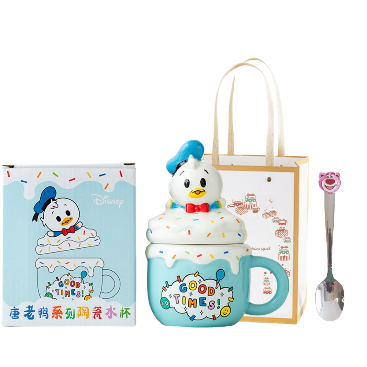 Набор: Снупи Дональд Дак с крышкой, стаканчик 280 мл + ложка Lotso + сумка для покупок