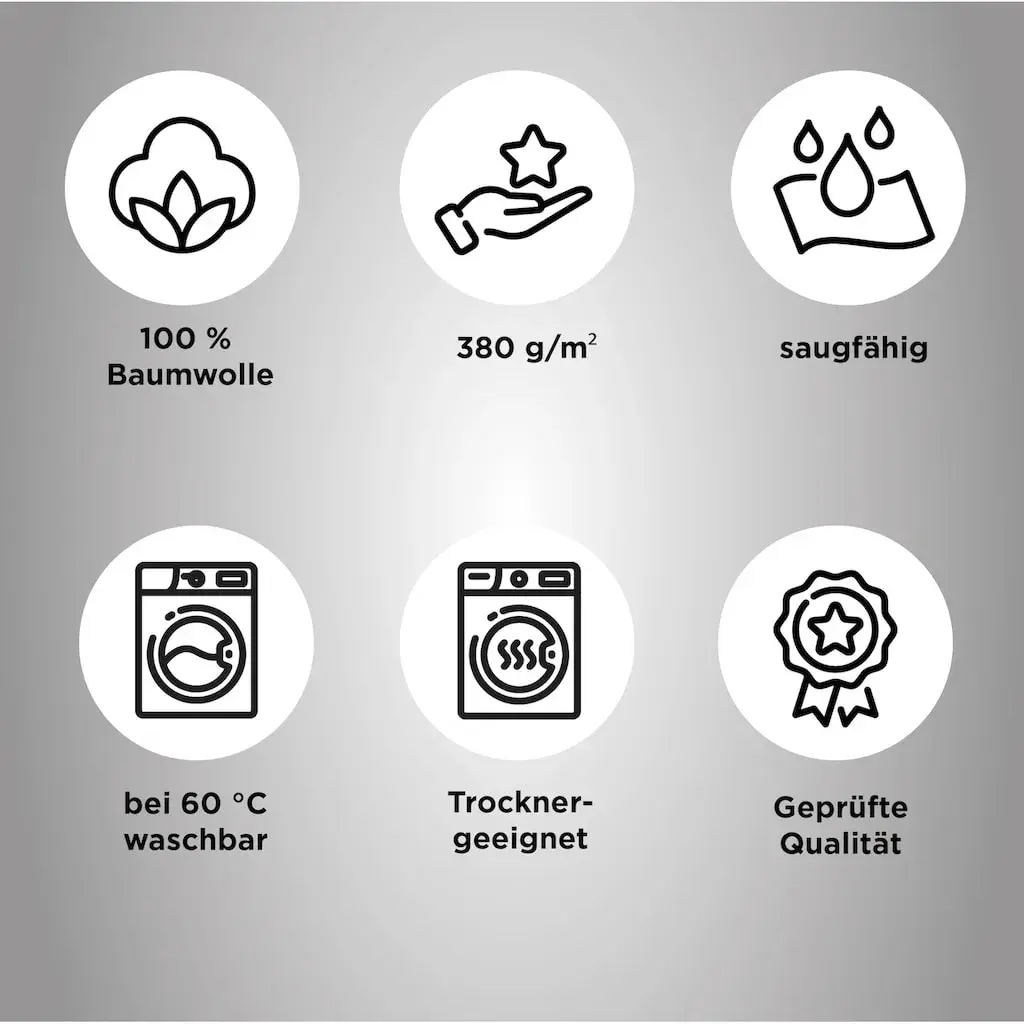Идеально для всей семьи и гостей: обширный набор полотенец »Kristall« от Dyckhoff. Доступный в замечательных однотонных цветах, он визуально привлекателен благодаря шнуровидным бордюрам на узких сторонах, которые придают набору утонченную элегантность. Благодаря двойному продольному шву полотенца особенно прочные и сохраняют форму после многочисленных стирок и сушки. Материал, использованный для изготовления и сертифицированный по STANDARD 100 by OEKO-TEX, считается чрезвычайно впитывающим и ощущается приятно мягким на влажной коже после душа или ванны. С помощью петель вверху и внизу банные полотенца легко повесить на крючки для просушки после использования. Стильно обеспечьте комфорт для семьи и гостей с помощью обширного набора полотенец »Kristall« от Dyckhoff с декоративными шнуровидными бордюрами.