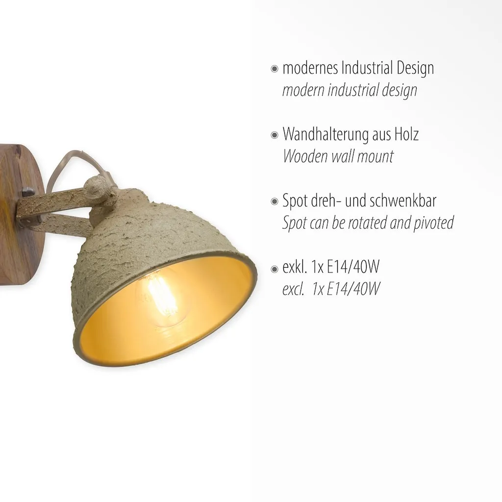 С помощью однофакельного настенного и потолочного светильника SAMIA вы создадите особенный акцент в ваших четырех стенах. Модная лампа в индустриальном стиле особенно уместна в гостиной, спальне и прихожих. Сочетание дерева на потолочной части и металлического абажура бежевого цвета в «грязевом» стиле придает потолочному светильнику особое очарование. Светильник поставляется без лампочки. Вы можете оснастить светильник лампой E14 мощностью до 40 Вт. Комбинируйте настенный светильник с любой лампой по вашему вкусу. Особый штрих создаст использование лампы с нитью накаливания. Светильник этой модели поворотный и наклоняемый, его можно регулировать так, чтобы свет попадал именно туда, где он нужен.