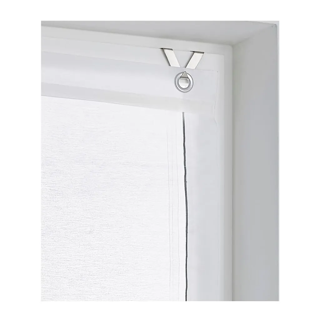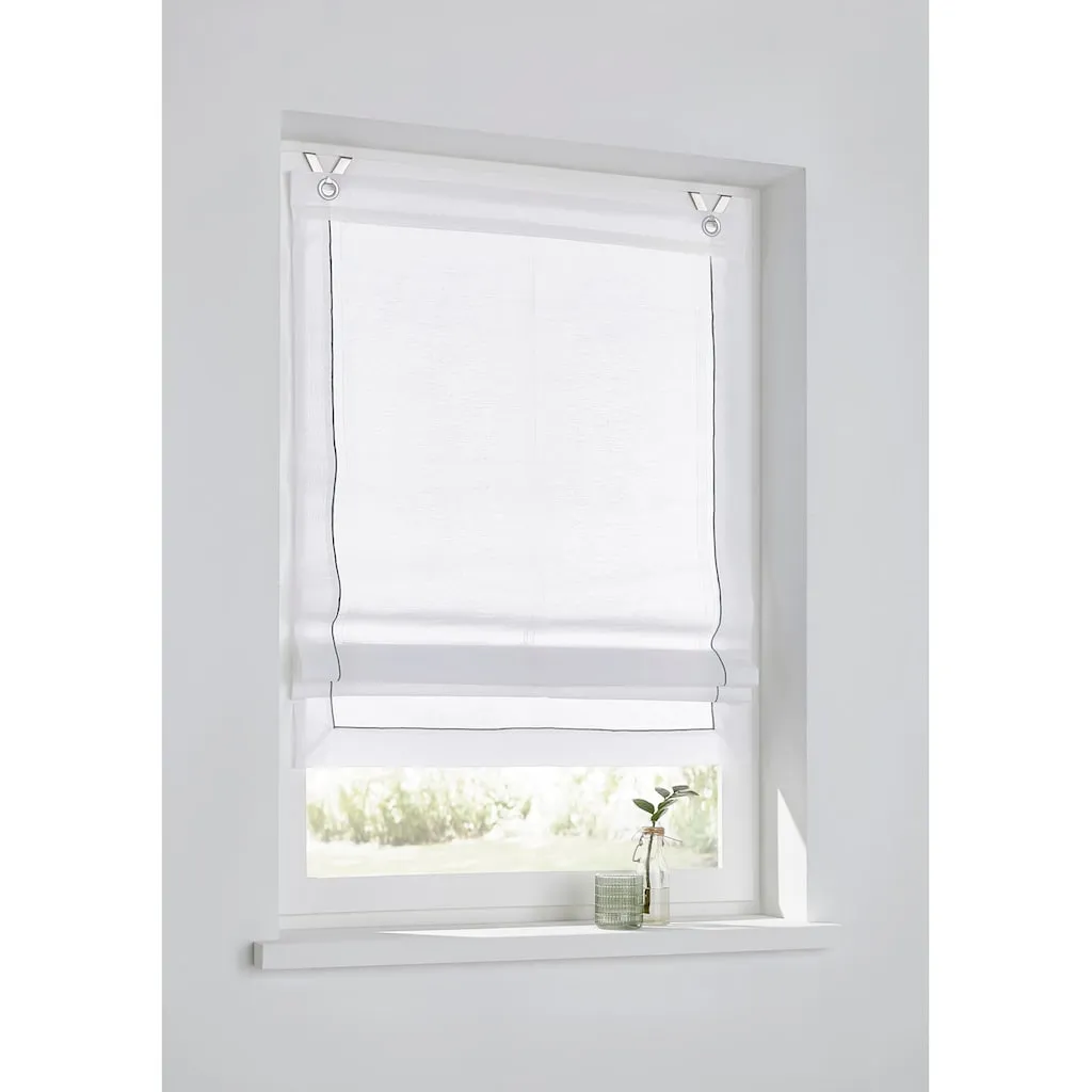 Полупрозрачная римская штора с серой декоративной строчкой и декоративным передним краем. С шнуровым механизмом и стопором; утяжеляющая планка сверху и снизу. С люверсами для легкого крепления к оконной раме. В комплекте поставляются крючки. 65% хлопок, 35% полиэстер. Можно стирать.