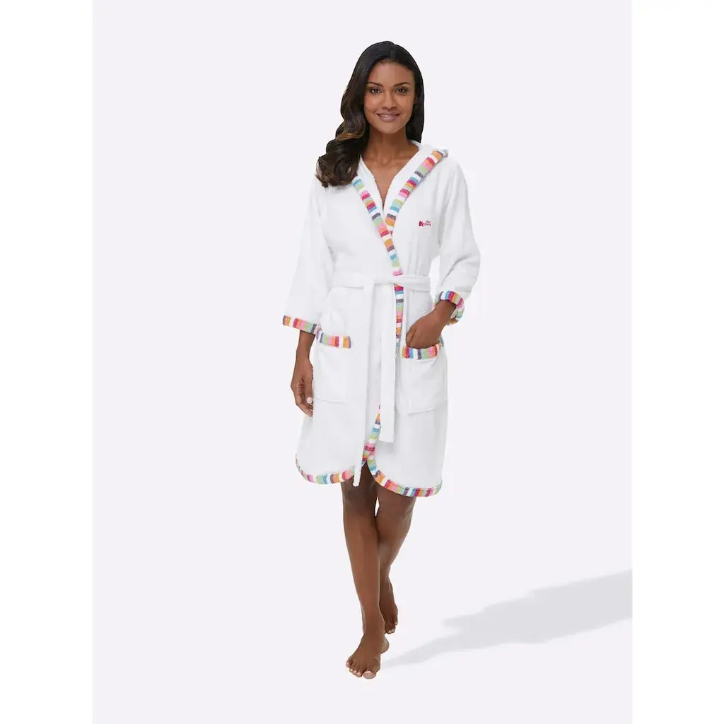 Халат в классическом кимоно-стиле с капюшоном и рукавами 3/4. Из удивительно мягкого велюрового махрового полотна. С двумя накладными карманами, петлями для пояса и поясным ремнем. Поддерживает инициативу Cotton made in Africa. 100% хлопок.