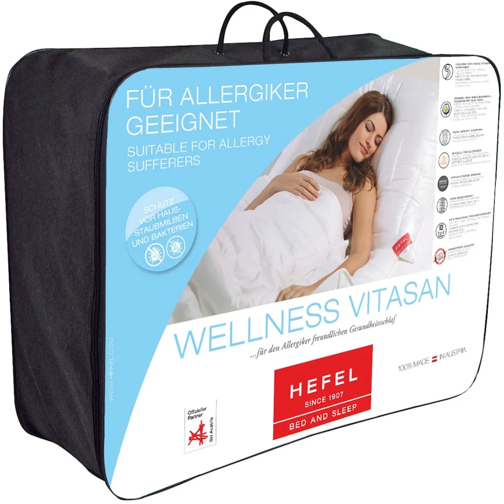ВЫДЫХНИТЕ С ОБЛЕГЧЕНИЕМ, АЛЛЕРГИКИ. Специально разработанное 4-поровое волокно Vitasan в постельных принадлежностях Wellness Vitasan эффективно защищает от всех видов аллергенов. Активное вещество, непосредственно введенное в волокно, не только активно предотвращает заселение клещами домашней пыли, бактериями и грибками, но и лишает уже существующие микроорганизмы жизненного пространства, прерывая их пищевую цепочку. Аллергики могут спокойно вздохнуть и спать спокойно. Благодаря своей 4-поровой форме волокно Vitasan необычайно легкое и дышащее, а наполнитель способен удерживать особенно большое количество теплого воздуха. Для обеспечения наилучшей гигиены постельные принадлежности Wellness Vitasan можно стирать при 60°C и сушить в сушильной машине.