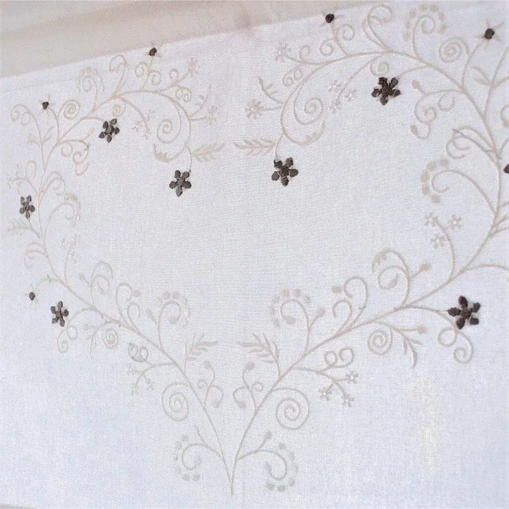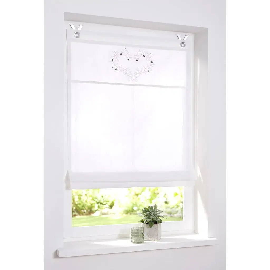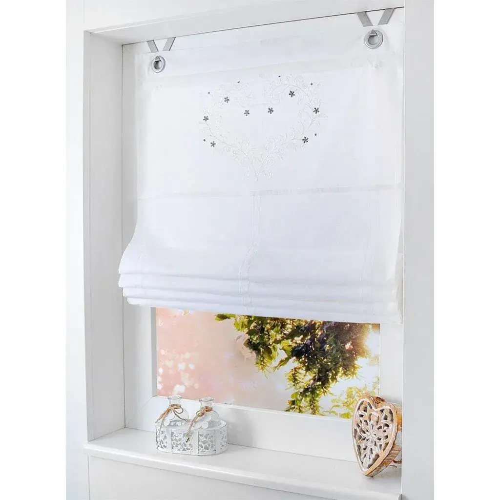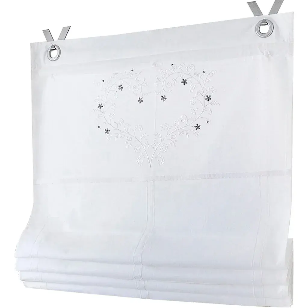 Римская штора из плотной ткани с нежной вышивкой в виде сердца. С люверсами для легкого подвешивания на оконной раме. Поставка включает крючки. Ширина 45-80 см: 2 крючка, ширина 100 см: 3 крючка. 100% хлопок. Можно стирать.