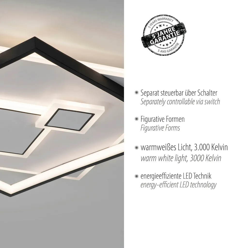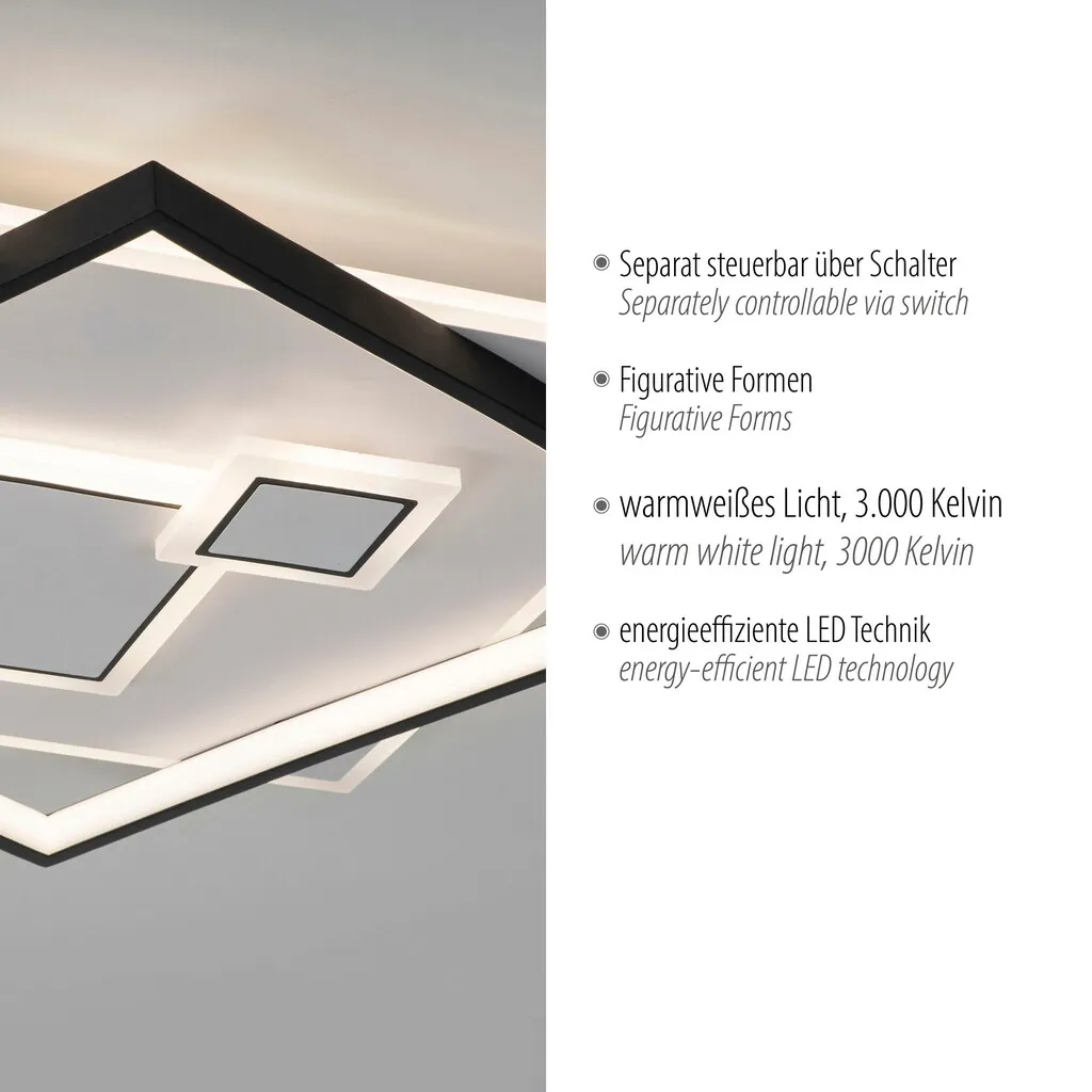 Новая серия светильников MAILAK в бело-черном исполнении с отдельным переключателем и приятными световыми полосами с температурой света 3 000 Кельвин впечатляет своим элегантным и одновременно современным квадратным дизайном. Она идеально подходит, например, для коридора, спальни или гостиной в качестве декоративного потолочного светильника.