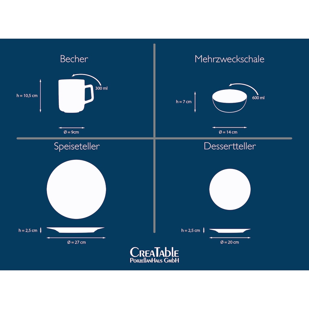 Материал Материал: фарфор Внешний вид/стиль Форма тарелки: круглая Цвет: белый Комплект состоит из Десертные тарелки: 4 шт. Чашки для кофе: 4 шт. Миски для мюсли: 4 шт. Обеденные тарелки: 4 шт. Размеры Вместимость чашки для кофе: 300 мл Диаметр обеденной тарелки: 27 см Диаметр десертной тарелки: 20 см Диаметр миски для мюсли: 14 см Подробности о продукте Область применения: домашнее использование Количество персон: 4 Указания Уход: можно мыть в посудомоечной машине