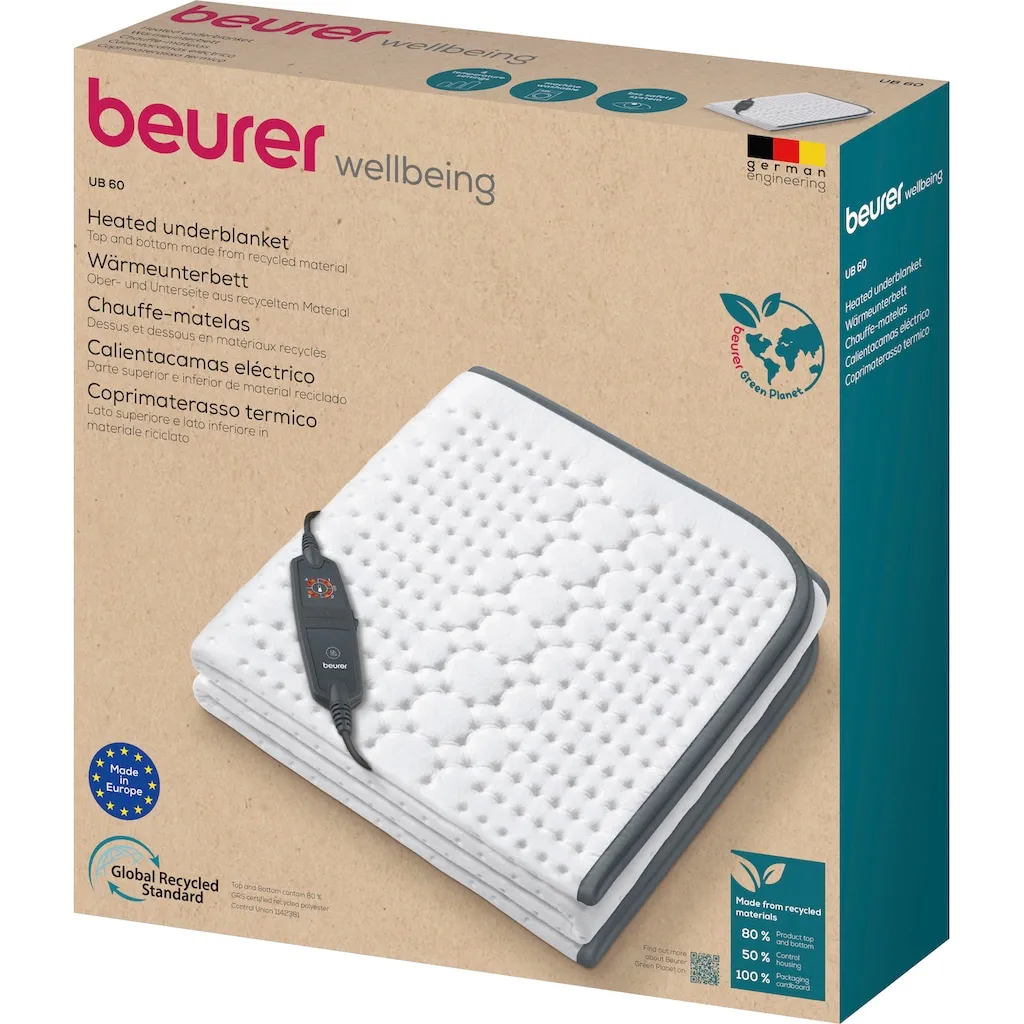 Электропододеяльник UB 60 из серии Green Planet от Beurer сохраняет вашу постель теплой и уютной в холодные ночи. Верхняя и нижняя стороны изделия выполнены примерно на 80% из сертифицированного переработанного мягкого флиса. С помощью съемного ручного регулятора можно выбирать между 4 уровнями температуры, при этом уровни 1 и 2 являются экономичными. Автоматическое снижение температуры по истечении 3 часов переводит уровни 3 и 4 на уровень 2, а встроенный таймер через 12 часов автоматически выключает пододеяльник. Система безопасности Beurer предотвращает перегрев. Поэтому вы можете не беспокоиться и спокойно спать всю ночь в уютном тепле.