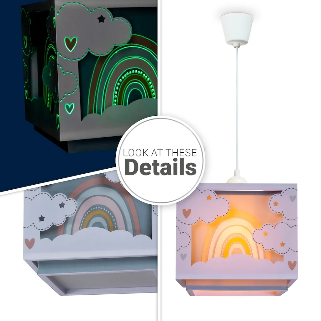 ОПТИКА - Эта модная подвесная лампа выполнена в светлых, ненавязчивых цветах и с детским мотивом радуги,СТИЛЬ - Яркий дизайн и мотивы, подходящие для детей, делают эту лампу изюминкой любой детской комнаты,МАТЕРИАЛ - Лампа изготовлена из высококачественного пластика, поэтому она особенно легкая и прочная,ДЕТАЛИ - С одной лампочкой и патроном E27, вы можете использовать любую лампочку E27 мощностью до 15 Вт.