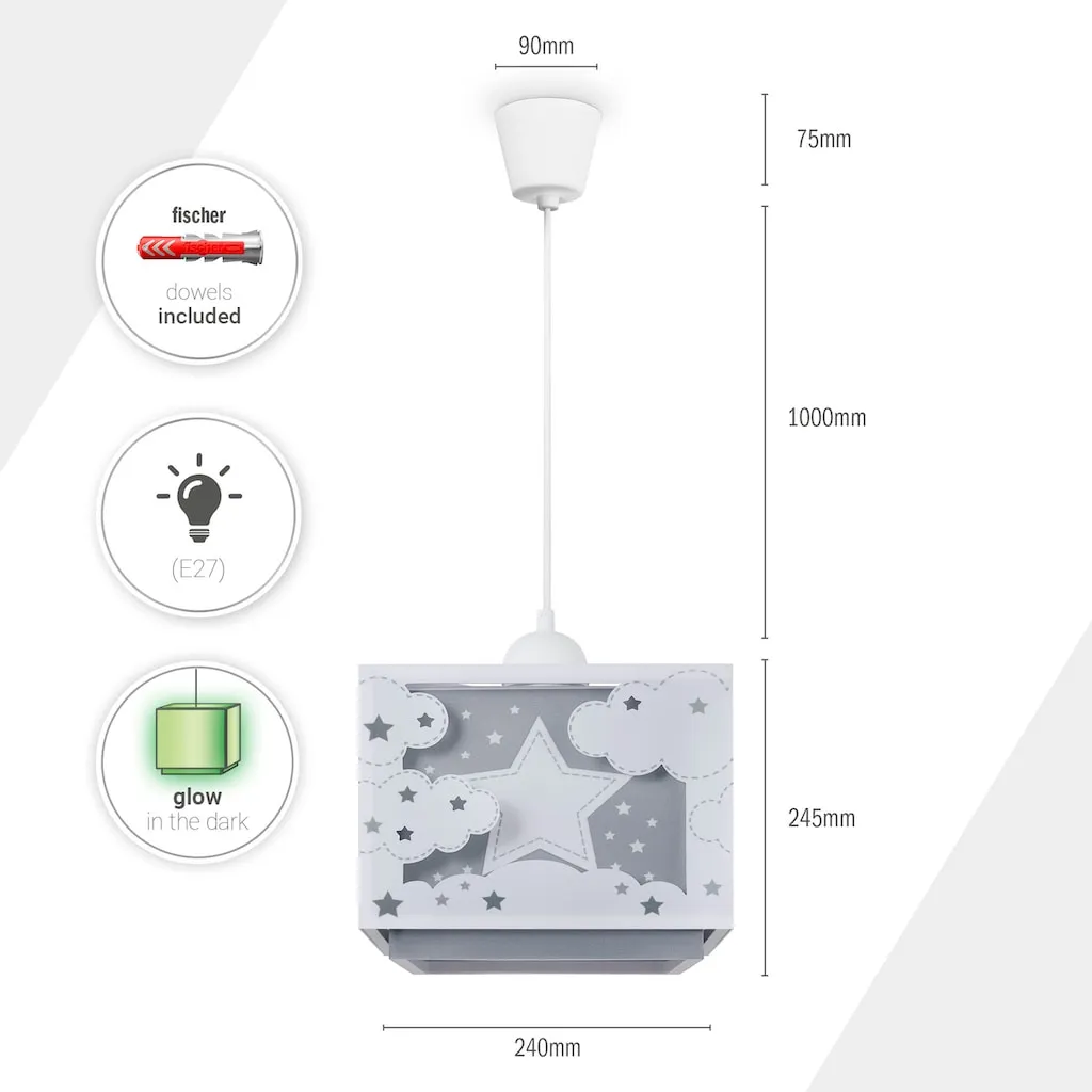 ВНЕШНИЙ ВИД - Этот модный подвесной светильник из высококачественных материалов впечатляет сдержанными цветовыми вариациями и уютным, игривым звездным мотивом. СТИЛЬ - С детским мотивом и мягким светом светильник создает в любой детской комнате волшебную атмосферу. МАТЕРИАЛ - Легкий и прочный, изготовленный из устойчивого пластика, этот светильник выдерживает даже самые бурные игры. ДЕТАЛИ - Одноламповый, с цоколем E27, позволяет использовать любую лампу E27 мощностью до 15 Вт.