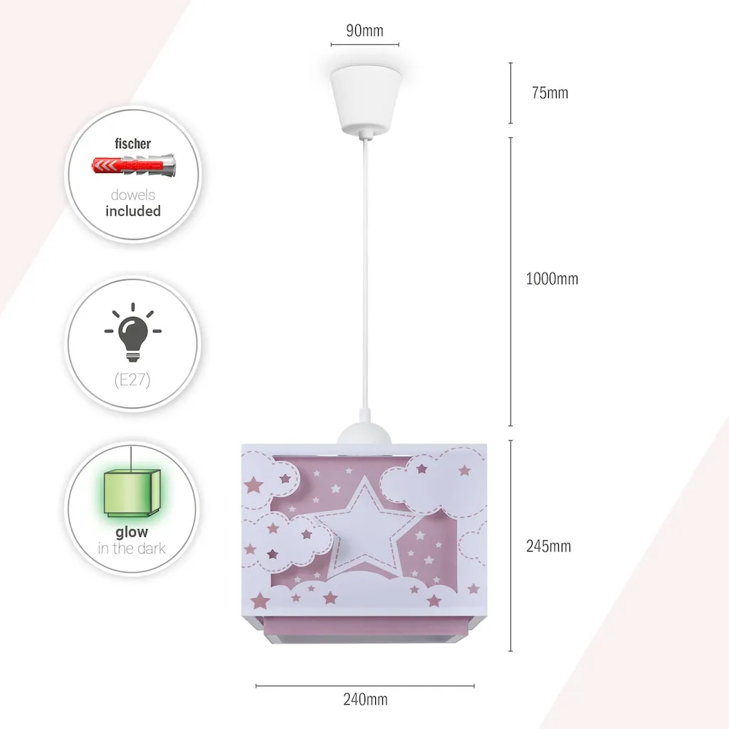 ВНЕШНИЙ ВИД - Этот модный подвесной светильник из высококачественных материалов впечатляет сдержанными цветовыми вариациями и уютным, игривым звездным мотивом. СТИЛЬ - С детским мотивом и мягким светом светильник создает в любой детской комнате волшебную атмосферу. МАТЕРИАЛ - Легкий и прочный, изготовленный из устойчивого пластика, этот светильник выдерживает даже самые бурные игры. ДЕТАЛИ - Одноламповый, с цоколем E27, позволяет использовать любую лампу E27 мощностью до 15 Вт.