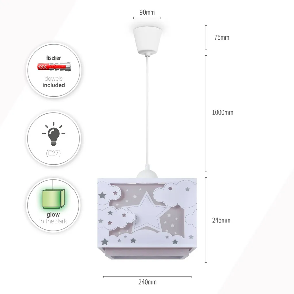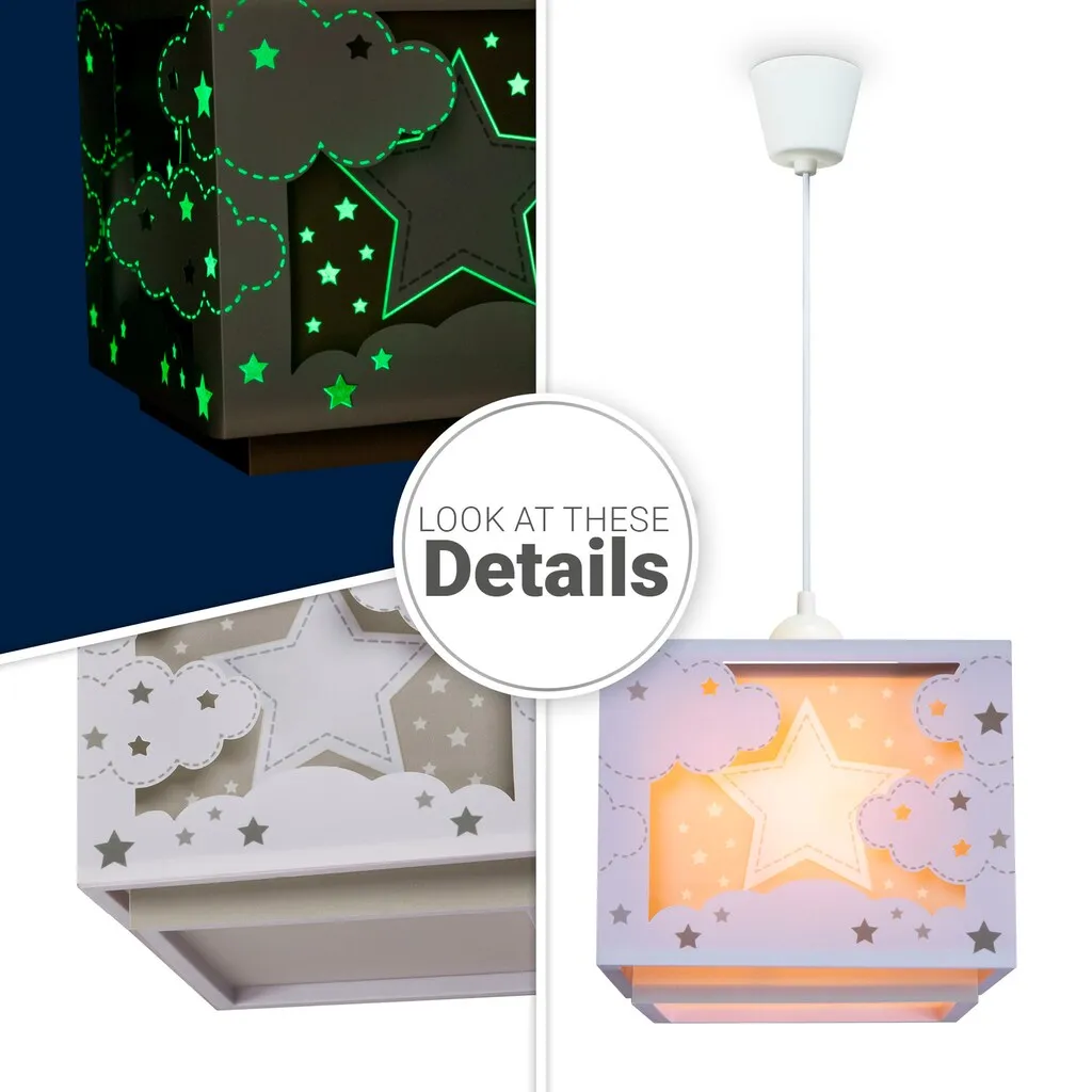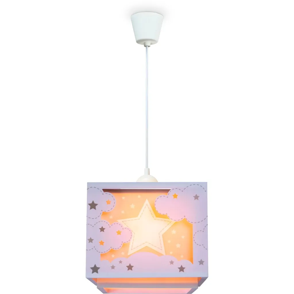 ВНЕШНИЙ ВИД - Этот модный подвесной светильник из высококачественных материалов впечатляет сдержанными цветовыми вариациями и уютным, игривым звездным мотивом. СТИЛЬ - С детским мотивом и мягким светом светильник создает в любой детской комнате волшебную атмосферу. МАТЕРИАЛ - Легкий и прочный, изготовленный из устойчивого пластика, этот светильник выдерживает даже самые бурные игры. ДЕТАЛИ - Одноламповый, с цоколем E27, позволяет использовать любую лампу E27 мощностью до 15 Вт.