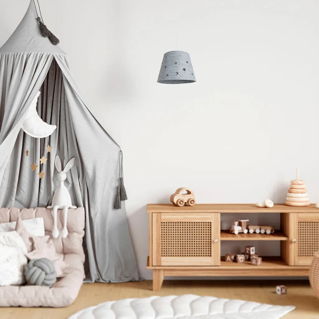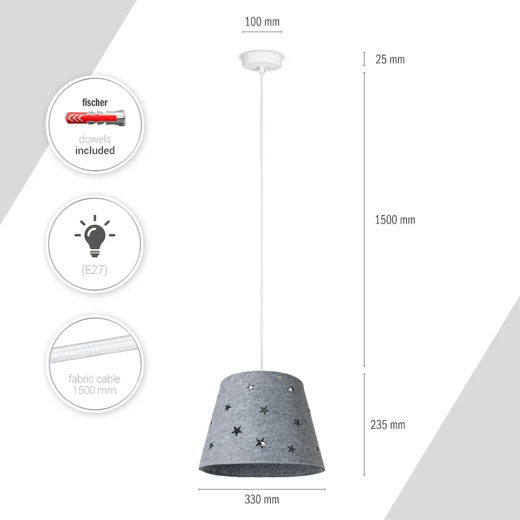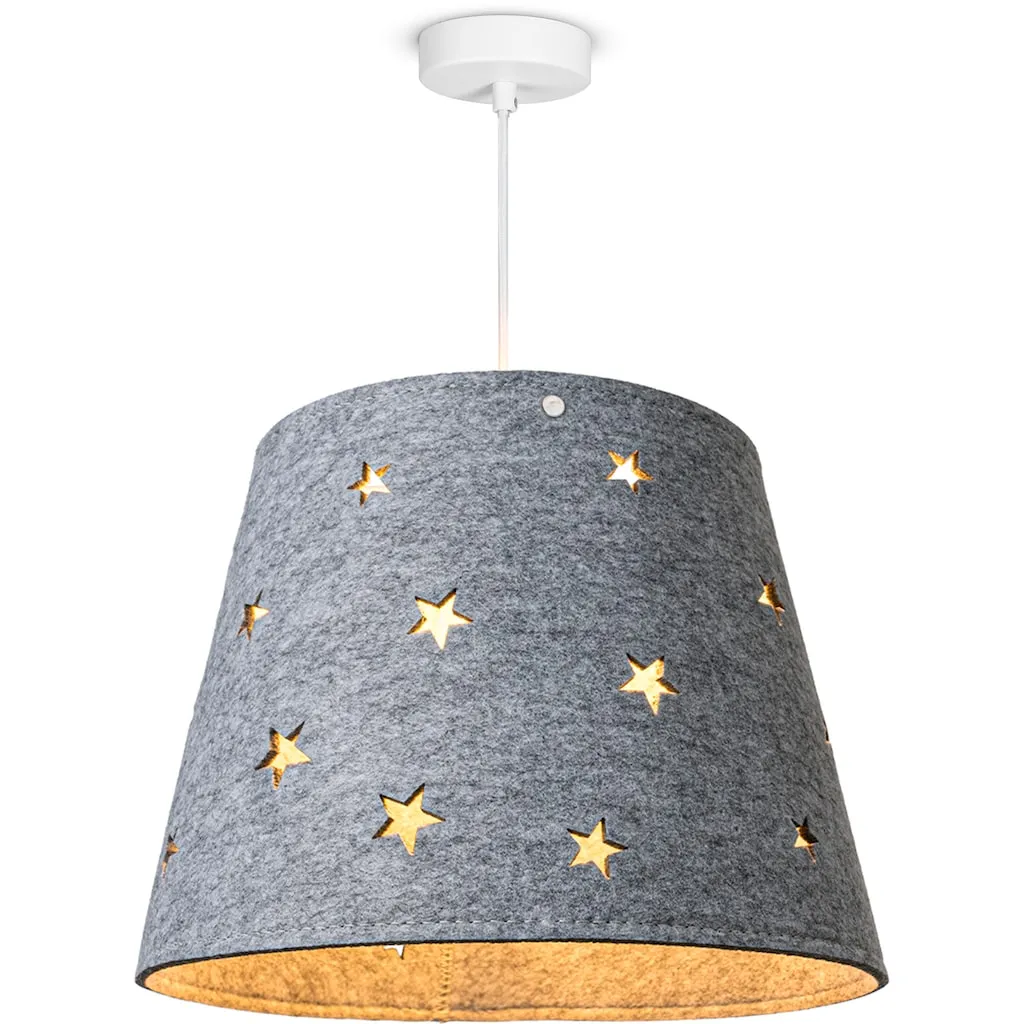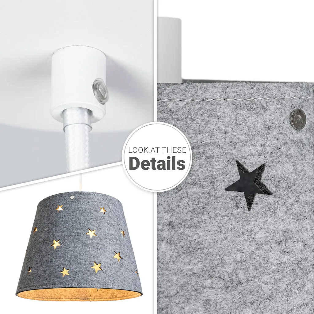 ОПТИКА - Этот сдержанный подвесной светильник в простом белом цвете восхищает уютными абажурами из фетра с игривым звездным дизайном и яркими цветами, СТИЛЬ - Современный, модный и полный хорошего настроения - стильный подвесной светильник создает уютное освещение и цветовые акценты, МАТЕРИАЛ - Прочный светильник изготовлен из прочного и легкого алюминия и оснащен высококачественным абажуром из фетра, ДЕТАЛИ - На одну лампу с цоколем E27, вы можете использовать любую лампу E27 мощностью до 25 Вт.
