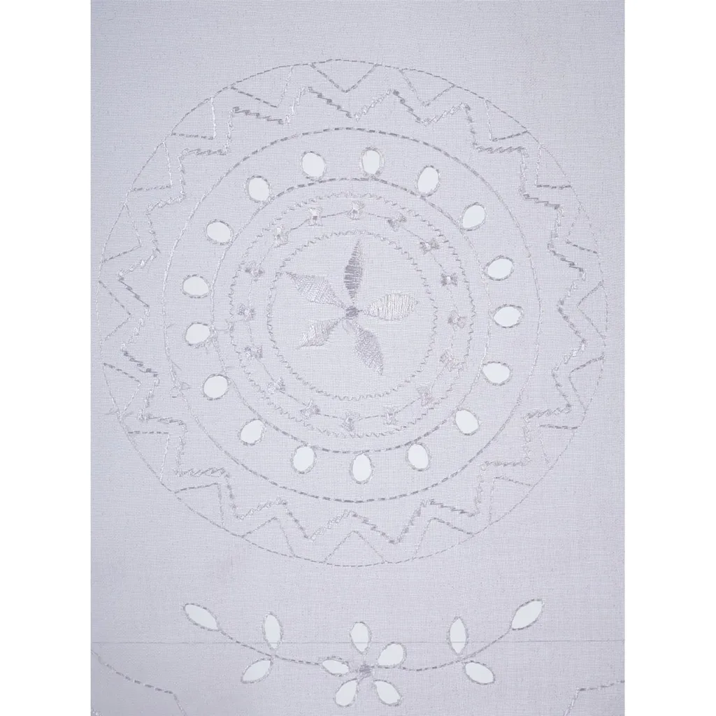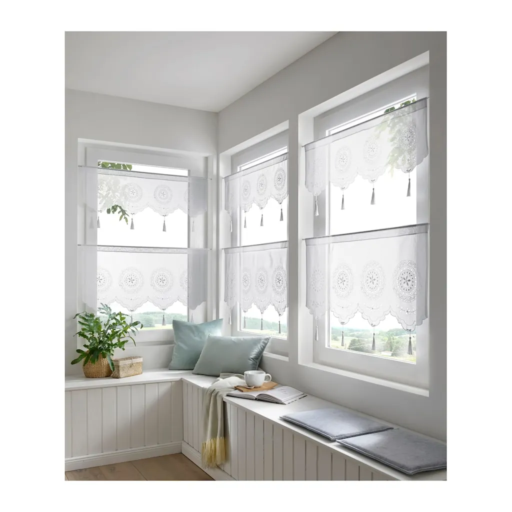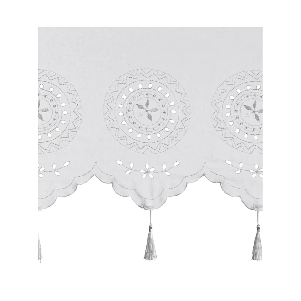 Панели с отвязными кисточками и сложной вышивкой с отверстием. Мягкая и текучая ткань. С туннелем для карниза. Закругленные края. 100% полиэстер. Можно стирать.