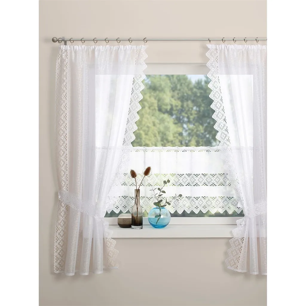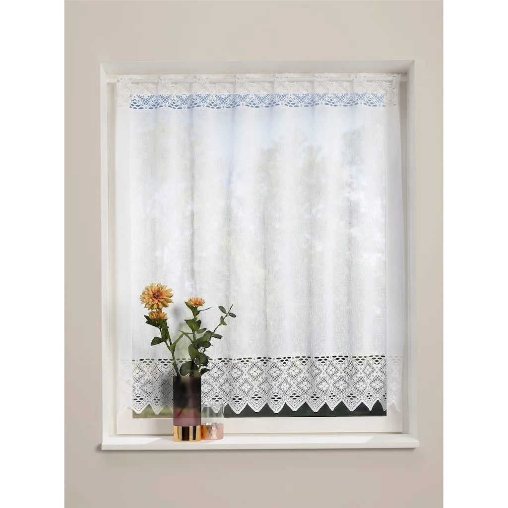 С изысканной структурой: оконная штора и декоративная сборка в стиле макраме. Легко ухаживать. Оконная штора с люверсами, декоративная сборка с тесьмой для сборки. Размеры = размеры ткани (примерно высота x ширина). 100% полиэстер. Щадящая стирка при 30 °C.