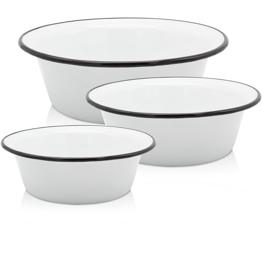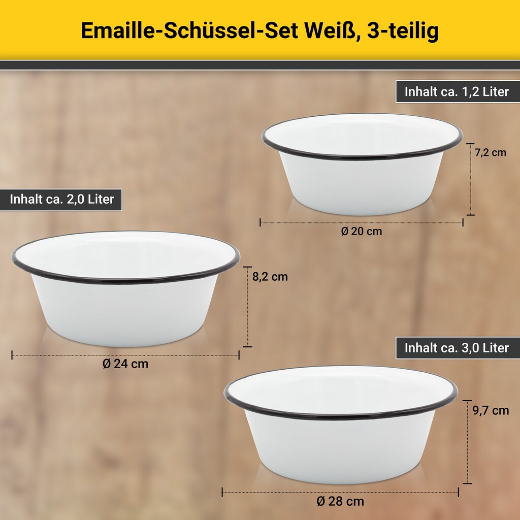 НАБОР ЭМАЛИРОВАННОЙ ПОСУДЫ БЕЛЫЙ: Наш высококачественный набор эмалированных мисок состоит из трех практичных мисок (20, 24 и 28 см).,ПОВЕРХНОСТЬ УСТОЙЧИВАЯ К РЕЗАМ И ЦАРАПИНАМ: Долговечная, устойчивая к разрезам и царапинам поверхность эмалированных мисок обеспечивает гигиеничность, нейтральность вкуса и уникальный аромат.,ЭМАЛЕВОЕ КАЧЕСТВО: Эмалированная посуда изготовлена из натуральных сырьевых материалов и поэтому идеально подходит для аллергиков.,МНОГОФУНКЦИОНАЛЬНОЕ ИСПОЛЬЗОВАНИЕ: Миски можно использовать как практичный кухонный помощник для приготовления салатов и соусов или для подачи сладостей.,ПОДХОДИТ ДЛЯ ПОСУДОМОЕЧНОЙ МАШИНЫ: Эмалированные миски подходят для мытья в посудомоечной машине, а также легко и просто моются вручную.