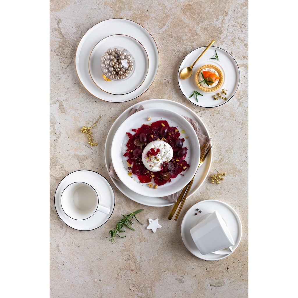 Современный фарфоровый вид в круглых скандинавских формах - это серия «Sita». Прочный, легкий фарфоровый материал идеально подходит для повседневного использования и подходит для посудомоечной машины и микроволновой печи. Контрастная, сдержанная кайма придает современный акцент.