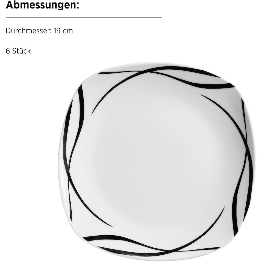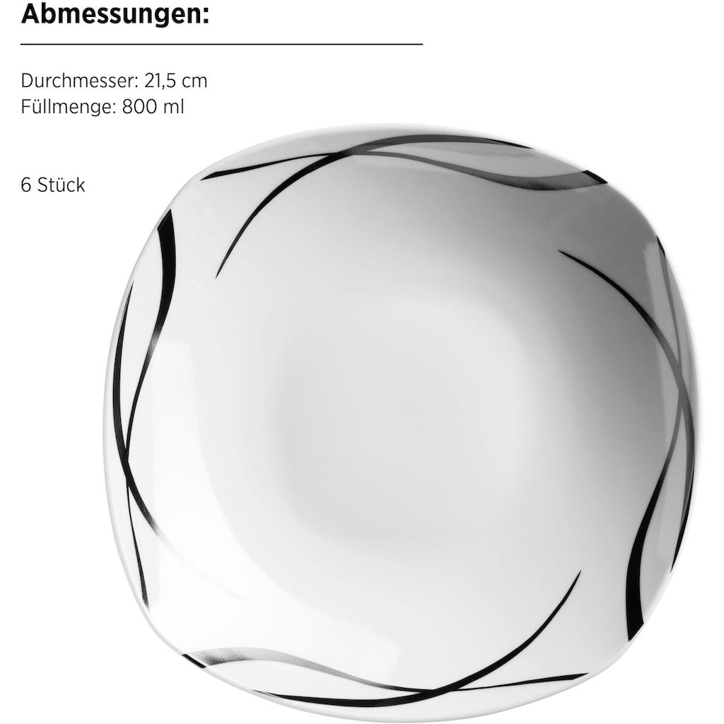 Больше, чем просто белая посуда: "Decora" сочетает классический белый фарфор с современными формами и вечным черным декором. Фарфоровая посуда привлекает внимание своими угловатыми формами и красивым блеском. От "Decora" вы, без сомнений, сможете получать удовольствие многие годы. Серия включает в себя обеденные тарелки, глубокие тарелки, десертные тарелки и кофейные чашки с блюдцами. Удобная в уходе посуда на 100% подходит для повседневного использования и пригодна для посудомоечной машины и микроволновой печи. Набор тарелок состоит из: 6 x плоские тарелки 25 см, 6 x глубокие тарелки 21,5 см, 6 x десертные тарелки 19 см