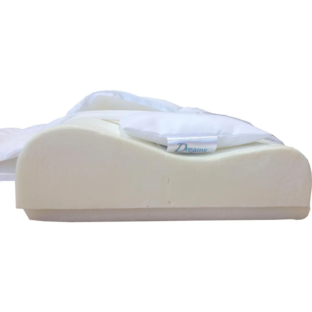 Эта подушка для шеи «DeLuxe Visco» марки Dreams изготовлена из вязко-эластической пены, имеет регулируемую вставку и подушку комфорта. Благодаря этим трем компонентам подушку можно регулировать по высоте, каждый компонент можно извлекать отдельно. Это также позволяет регулировать жесткость подушки. Все три компонента покрыты чехлом из джерси, что облегчает снятие наволочки. Чехол подушки выполнен из мягкого высококачественного хлопка и простеган полыми волокнами. На длинной стороне имеется застежка-молния.