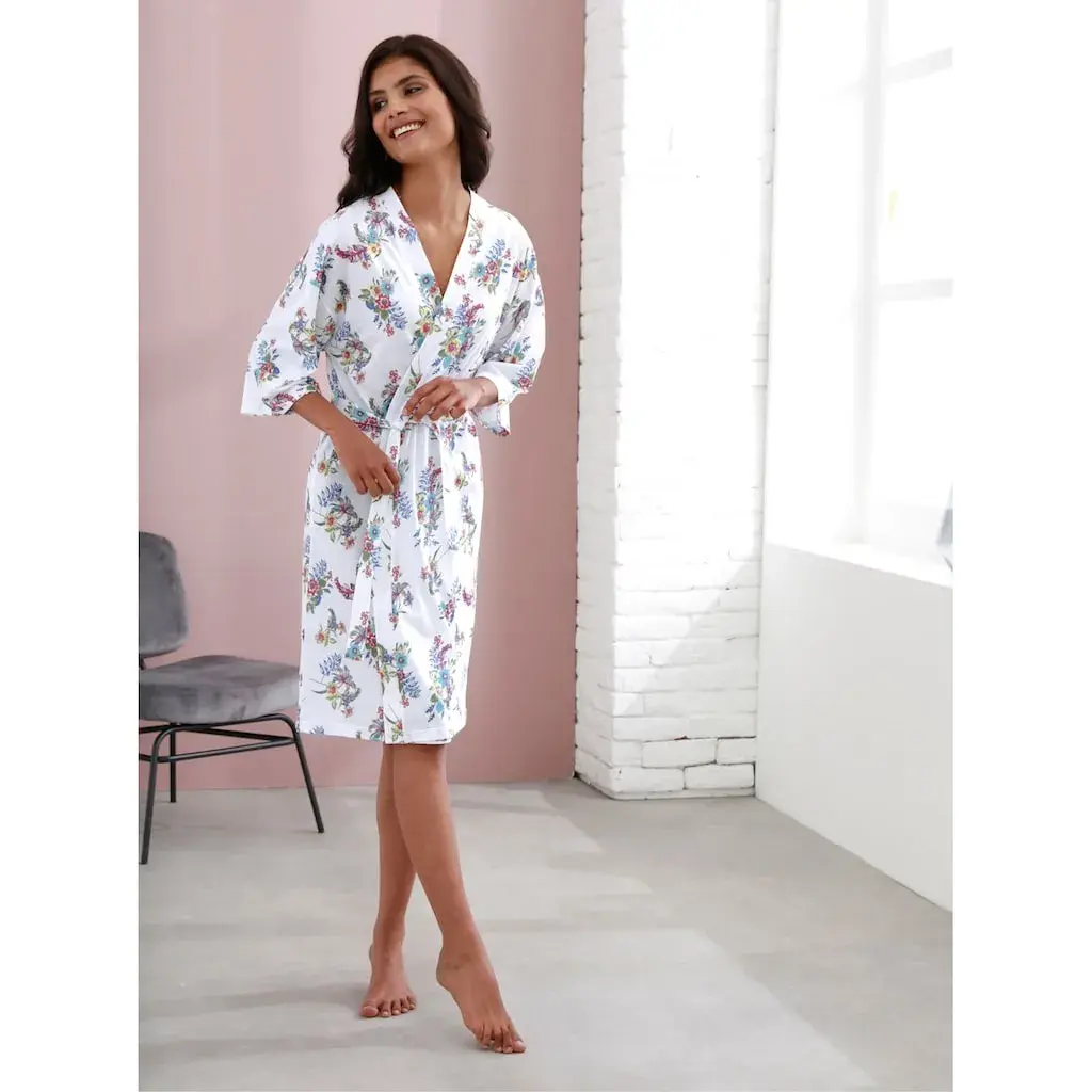 Великолепно! Халат кимоно с цветочным принтом. Пониженная линия плеч, рукава три четверти, петельки для пояса и пояс. Однослойный джерси. 100% хлопок.