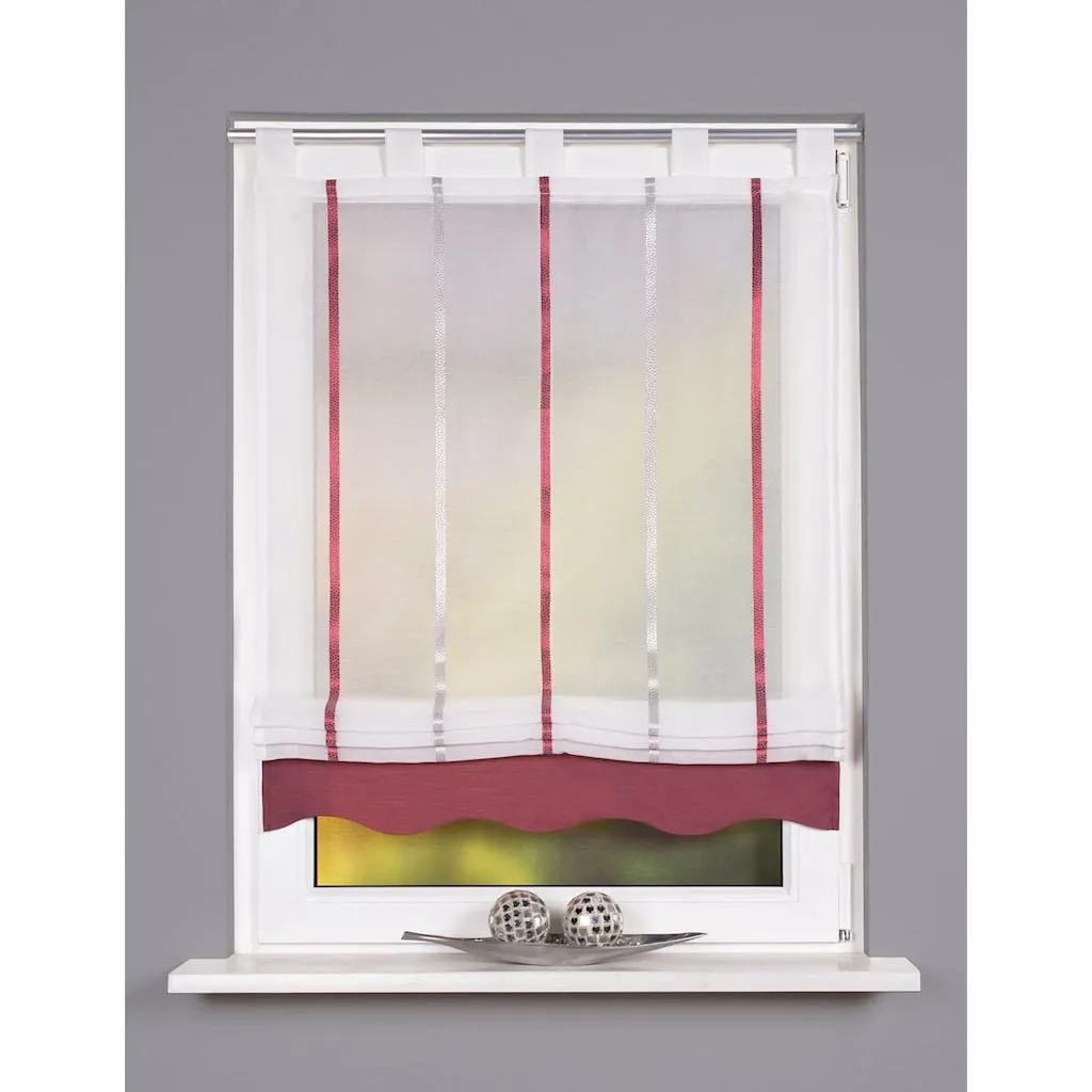 Римская штора из прозрачного вуали с цветными продольными полосами и подходящим декоративным воротником. Размеры см. в Интернете. 100% полиэстер. Можно стирать.