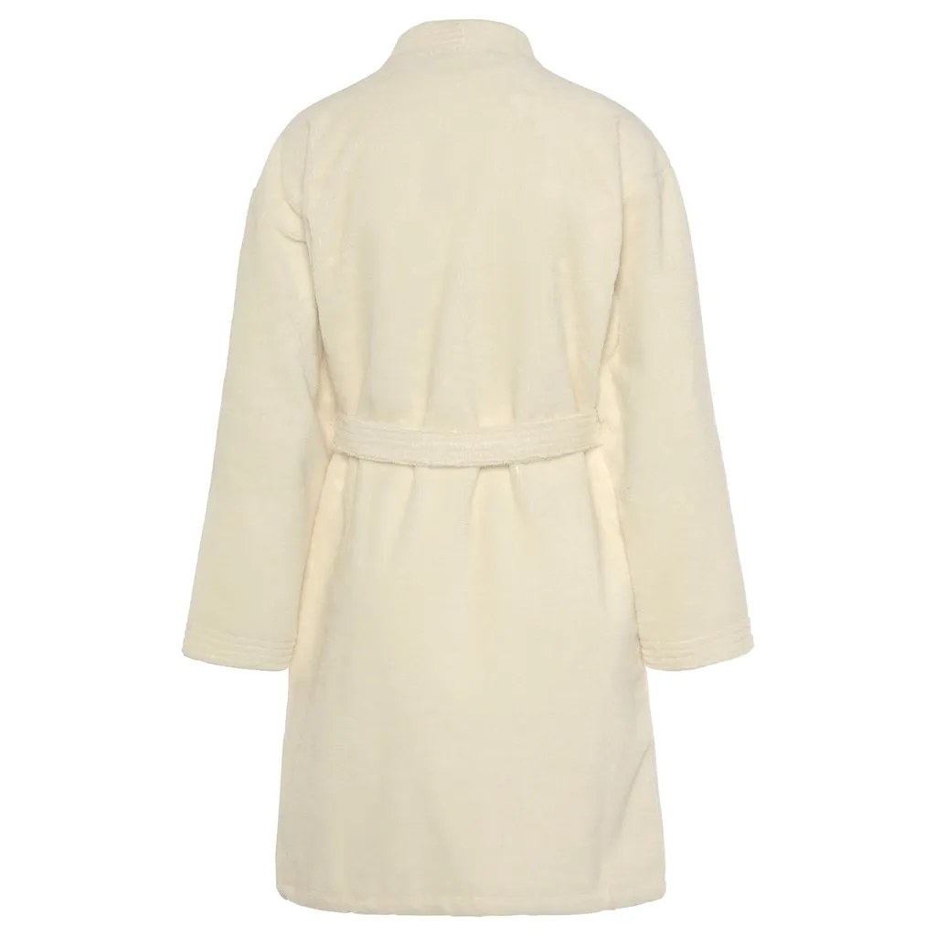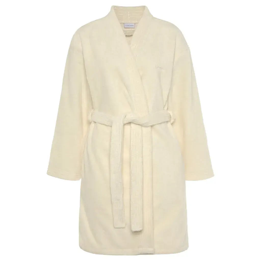 Халат кимоно короткой длины с продольной стежкой на манжетах рукавов и свободным поясом на талии. Из 60% хлопка, 40% полиэстера.
