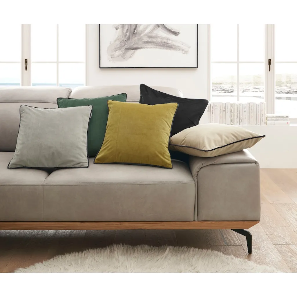 Здесь сочетаются уют и забота об окружающей среде: наволочка CORNER от Musterring изготовлена из Wirksamt и делает каждое прикосновение настоящим удовольствием. Особенность заключается в том, что текстильные волокна производятся из переработанных ПЭТ-бутылок. Для повторного использования требуется значительно меньше энергии, воды и нефти, чем при новом производстве, а выбросы CO2 также заметно снижаются. Кроме того, однотонные подушки размером 45 x 45 см являются настоящим украшением: они доступны в черном, светло-сером, бежевом, горчичном и елово-зеленом цветах, каждая из которых окантована декоративной тесьмой темно-серого цвета.