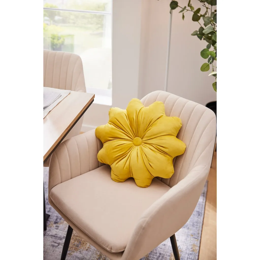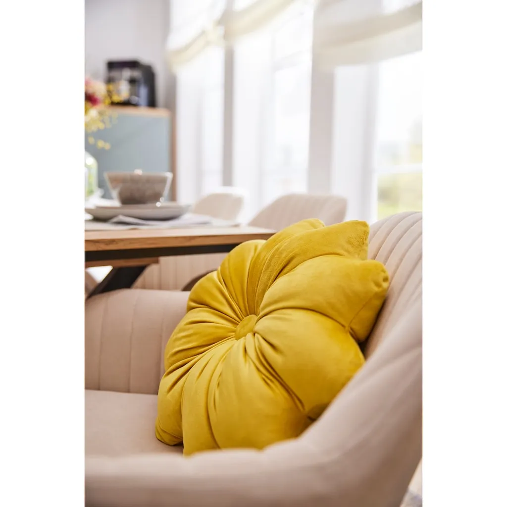 Подушка в форме цветка, чехол с эффектом бархата. С пуговичной прострочкой. Наполнитель из полиуретановой пены, толщина около 12 см. Чехол: 100% полиэстер. Можно стирать.