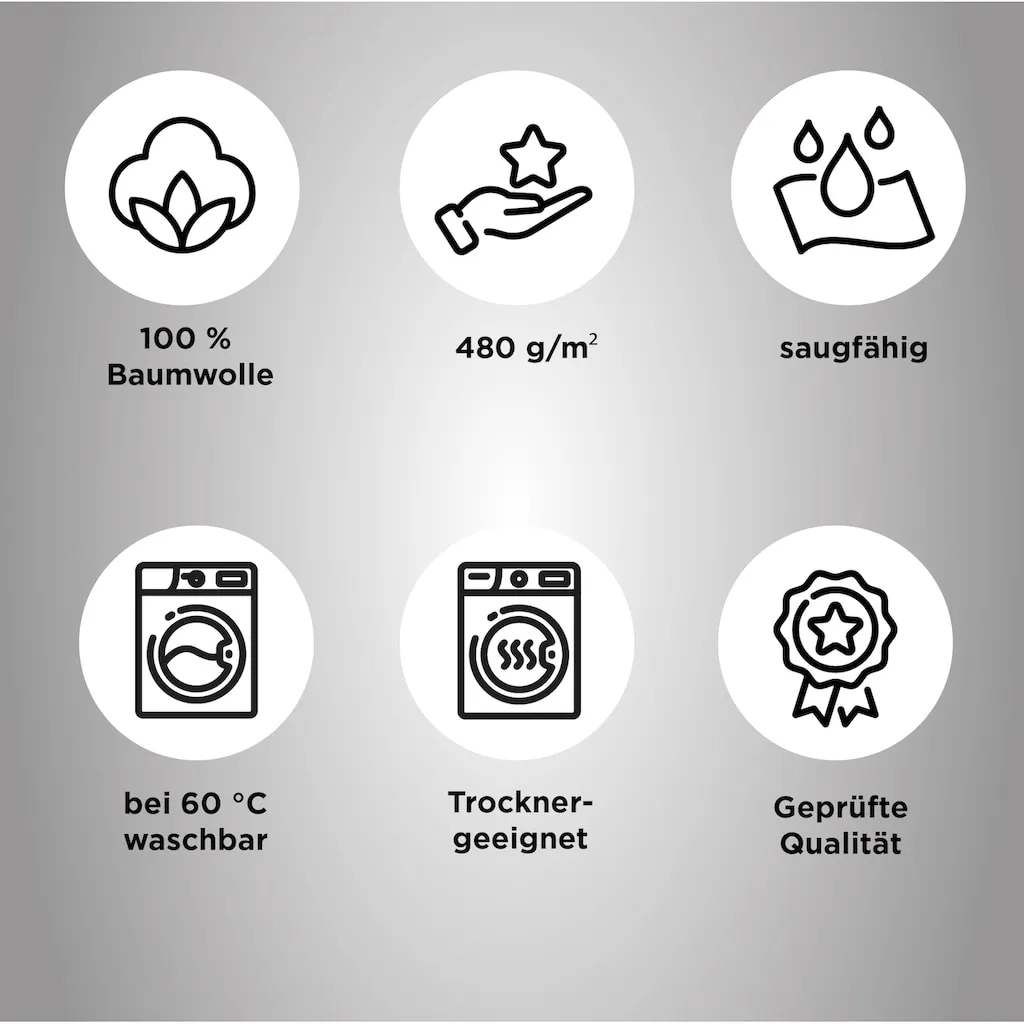 100% хлопок, плотность 480 г/м², очень пушистый, особенно впитывающий, машинная стирка при 60°C, подходит для сушки в сушильной машине