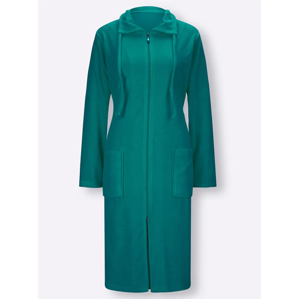 Халат из мягкого легкого фротте. С отложным воротником, кулиской и полной застежкой-молнией. 2 накладных кармана. 80% хлопок, 20% полиэстер. Можно стирать при температуре до 40 °C.