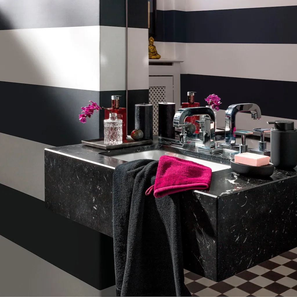 Роскошная линейка продукции из 60% хлопка / 40% вискозы из бамбуковой целлюлозы, привлекательная жемчужная текстура с шелковисто-глянцевыми бортиками, ценные свойства вискозного волокна: высокая впитываемость воды, антибактериальные, мало мнущиеся, шелковисто-мягкое полотенце для гостей в выразительных цветах, доступно в десяти цветах, можно стирать при 60° C и использовать в сушильной машине