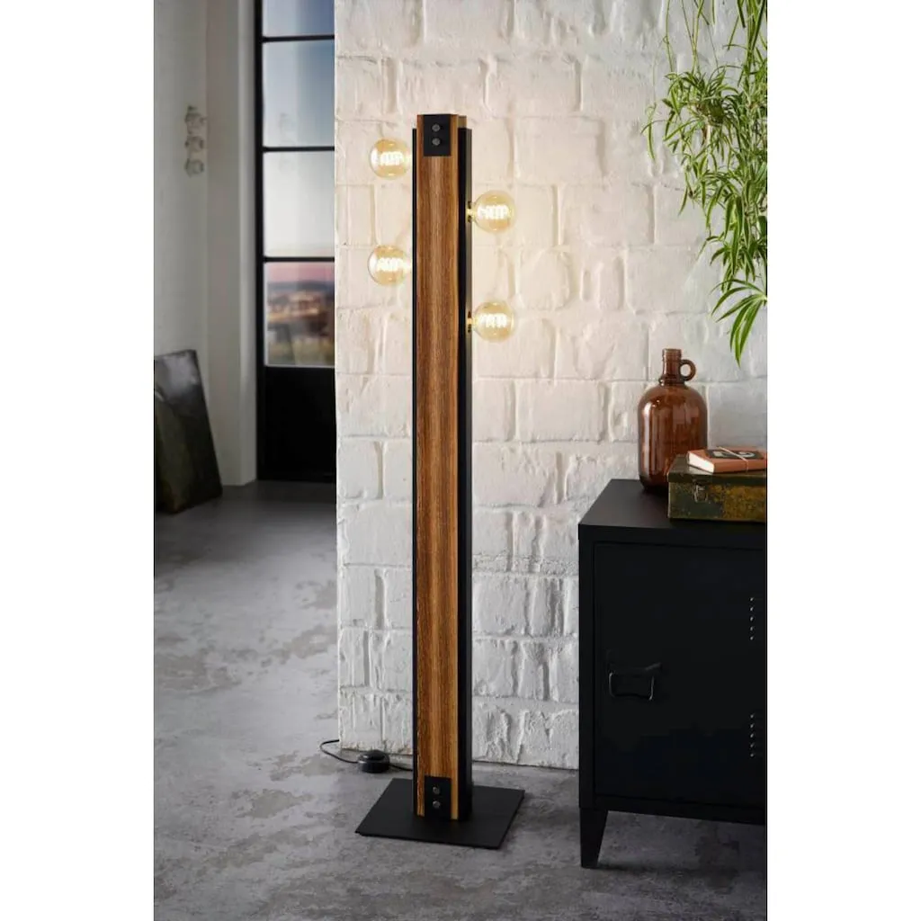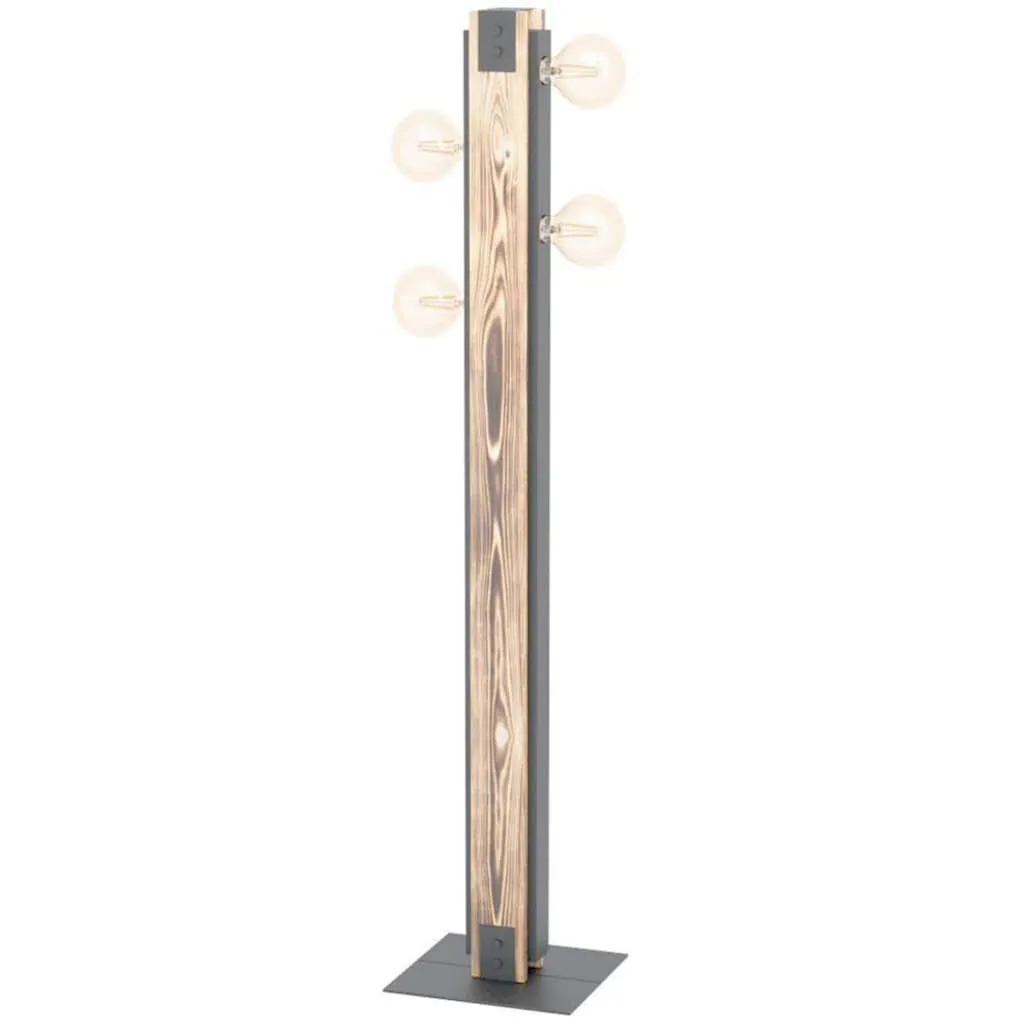 Торшер LAYHAM выполнен из черного металла с боковыми панелями из обожженного дерева и имеет четыре патрона. Также удобное включение и выключение возможно с помощью ножного выключателя на кабеле. Торшер гармонично вписывается в такие тенденции, как винтаж и индустриальный стиль, и станет особым украшением для любой комнаты - будь то спальня, гостиная или столовая. На иллюстрациях показаны лампы с нитью, которые не входят в комплект поставки. Светильник подходит для любых ламп с цоколем E27.