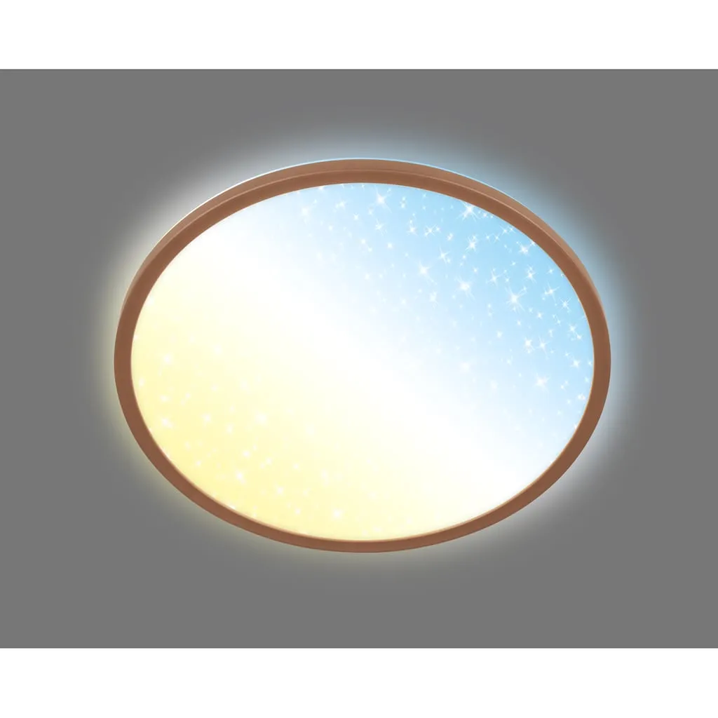 Плоская LED-панель CCT в цвете "кофе" с эффектом звездного неба для жилых помещений, спален и коридоров, 22 Вт LED (3.000 лм) с регулируемой цветовой температурой от 3.000K до 6.500K для любой атмосферы, плавная регулировка яркости с помощью пульта дистанционного управления с функцией запоминания для максимального комфорта, встроенный эффект подсветки для косвенного освещения и гармоничного восприятия пространства, компактные размеры (Ø375x45 мм), идеально для низких потолков и сдержанного интерьерного оформления