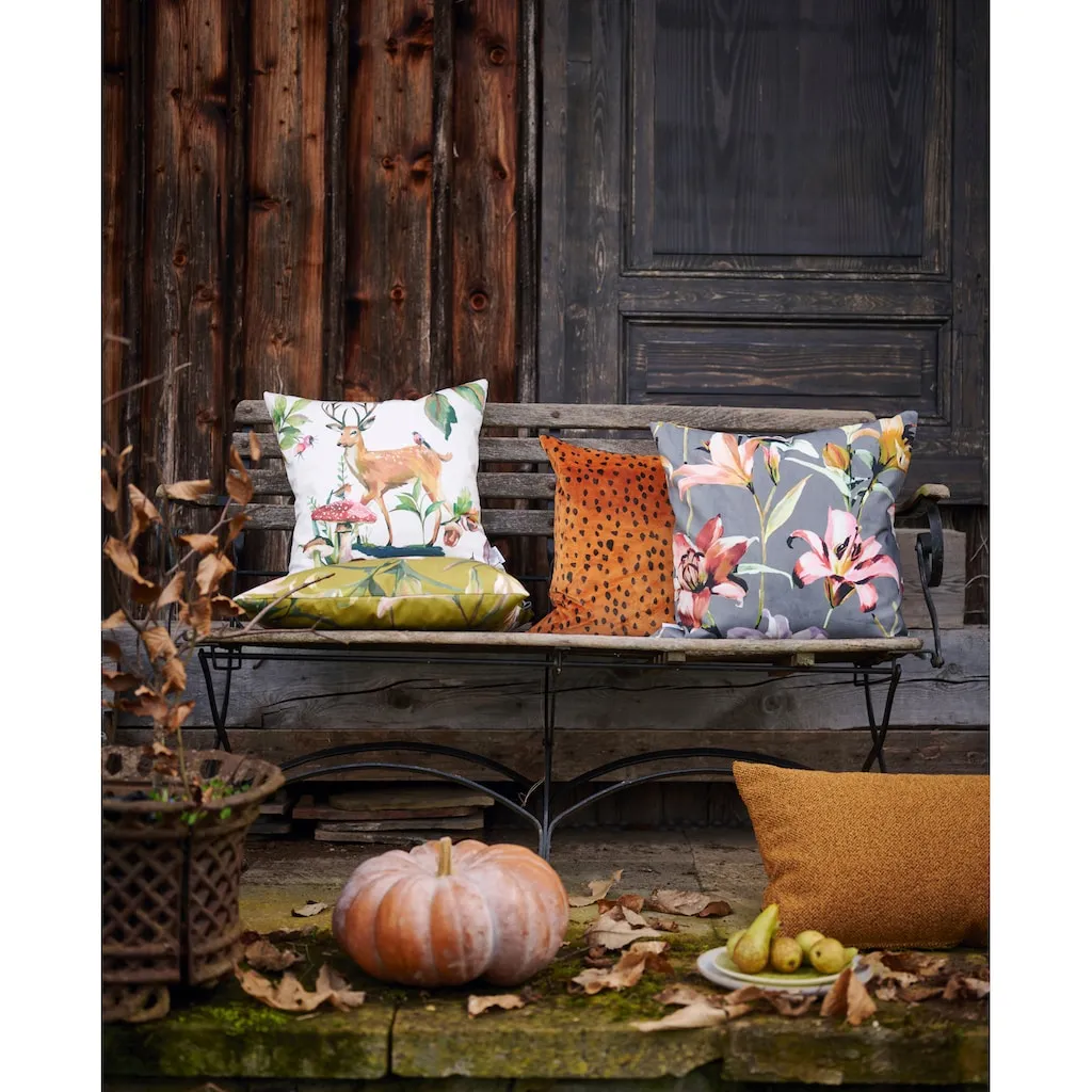 Романтичный олень и грибы. Любимый мотив осени. Милый житель леса украшает любые романтические осенние интерьеры, в двух прекрасных цветовых вариантах. Чехол для подушки оснащен практичной молнией. Высококачественная, живописная цифровая печать выполнена на 30% тонкого хлопка и 70% полиэстера. Можно стирать при 30°C в деликатном режиме, предварительно вывернув подушку наизнанку, сушить во влажном состоянии, гладить на втором уровне. Продукция прошла проверку на наличие вредных веществ по стандарту Ökotex 100 и произведена в Германии.